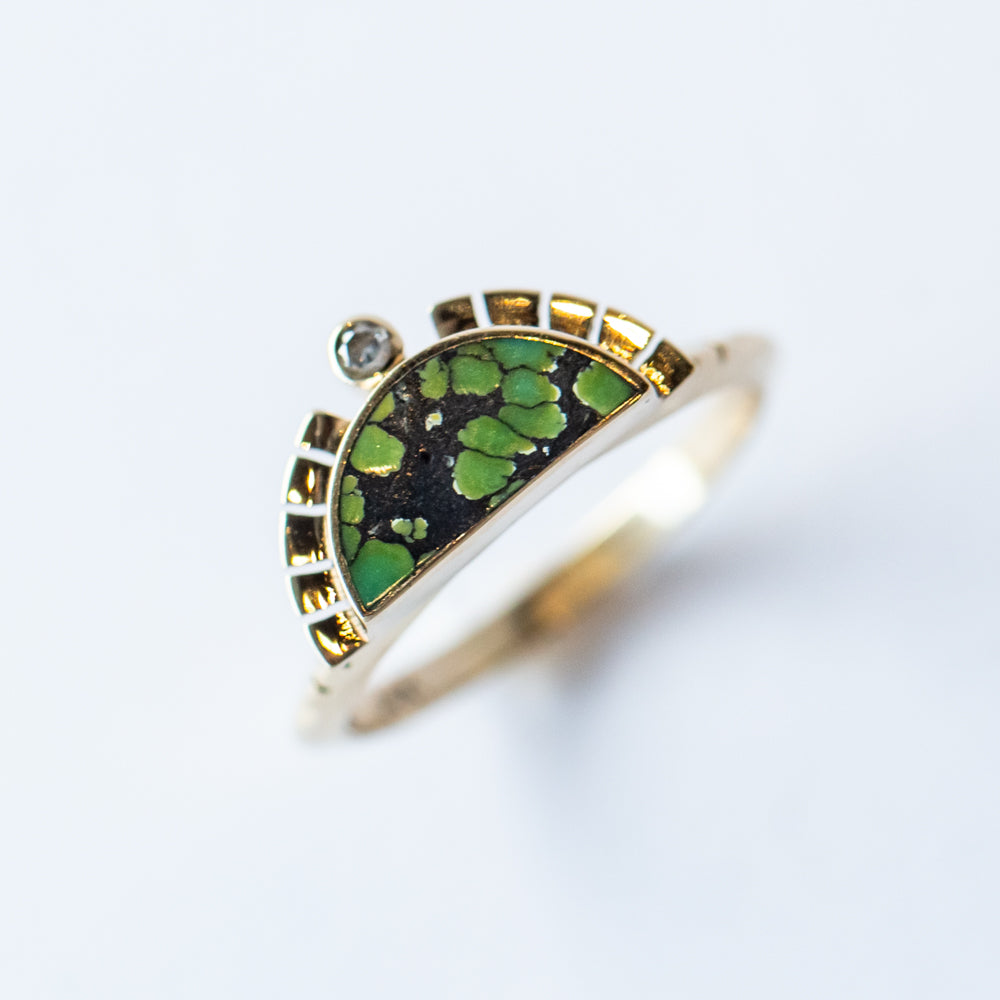 Hand-inlaid Peacock Turquoise is framed by golden sun rays and dotted with a single reclaimed diamond for just a whisper of brilliance. Long believed to be a stone of protection, healing, and truthful communication, turquoise is also a December birthstone, making this piece extra special for winter-born or turquoise-loving souls.
