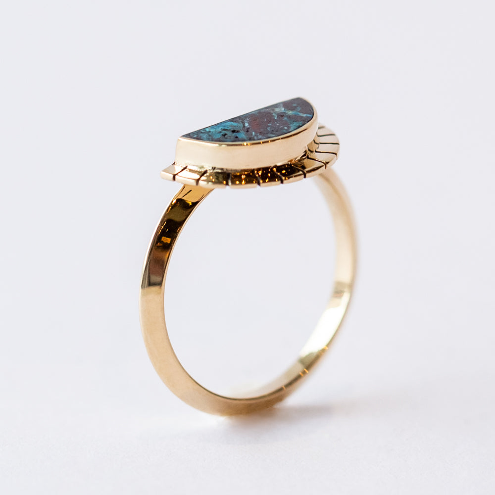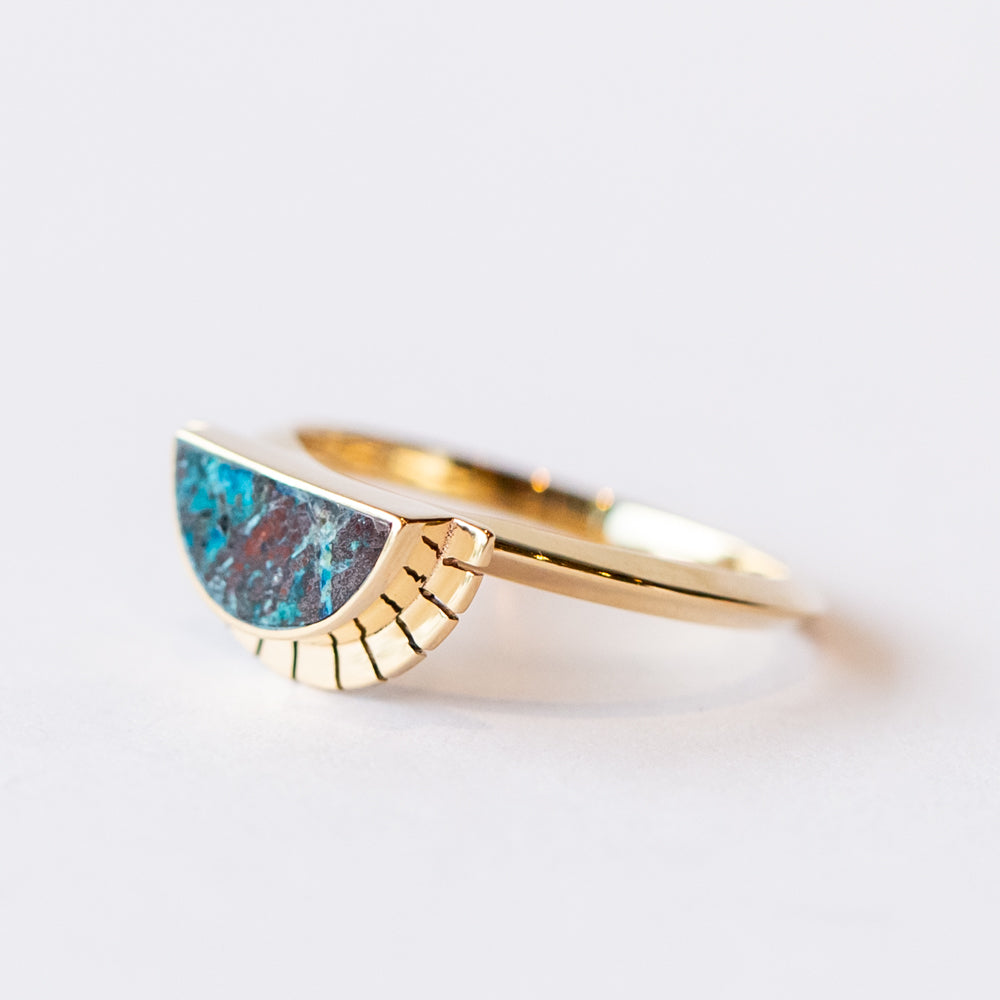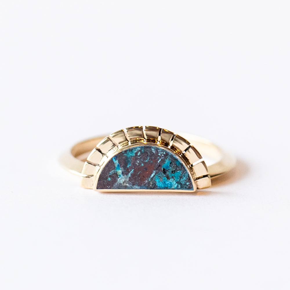 The Selene Ring by Young in the Mountains captures a horizon moment: a sun rising—or is it setting?—over a rich expanse of deep blue Shattuckite. Wrapped in 14k yellow gold, the half-moon shape radiates light thanks to a serrated halo that feels hand-drawn, ancient, and just a little bit magic.