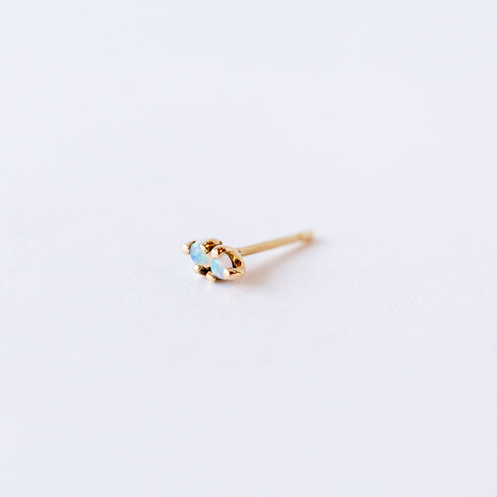 Tiny and totally perfect for everyday ear stacking, this two-step opal stud earring from Wwake belongs in your rotation. Crafted in polished gold, it seats two dainty opals in three-prong settings for a sort of diamond or triangular shape that gives you a playful, small stud earring great for solo minimalist looks or for pairing with other earrings from your collection.