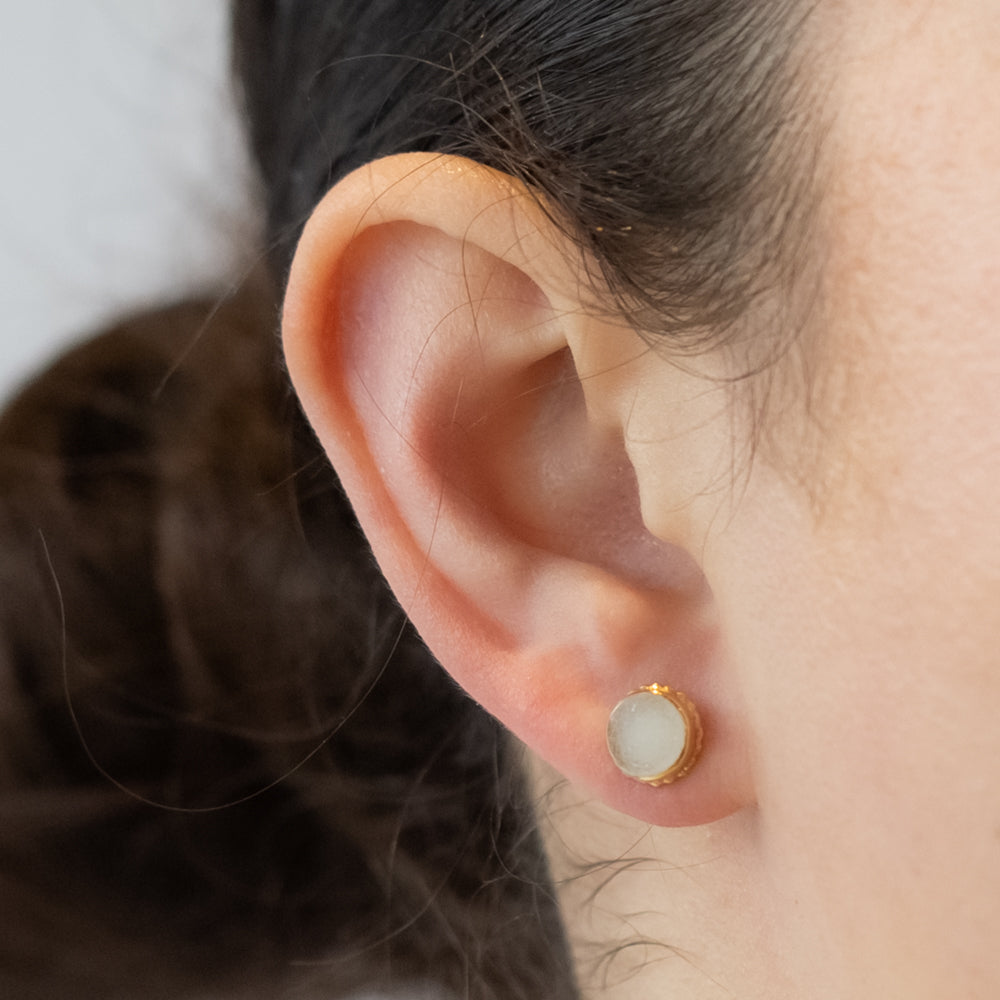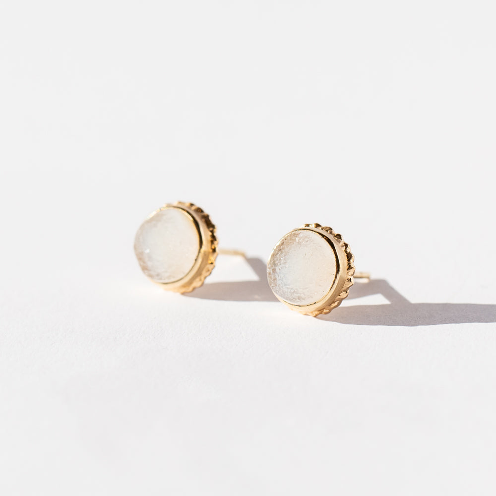 Round white Brazilian drusy studs set in a 14k yellow gold ruffle platform