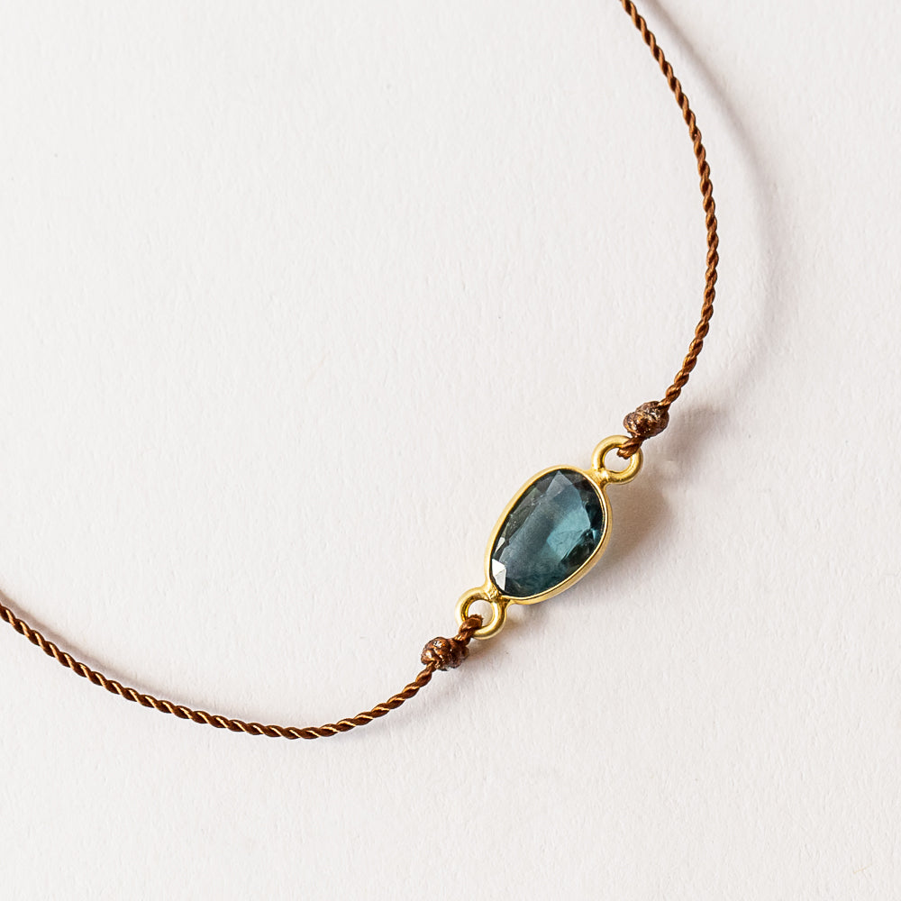 An offbeat sapphire with shifting blue-green tones sits on a minimalist cord, finished with a warm 18k gold bezel. Sapphires are September’s birthstone, tied to wisdom, clarity, and inner strength. The asymmetrical cut makes this one feel effortlessly one-of-a-kind—perfect for everyday wear or stacking with your other cord bracelets.