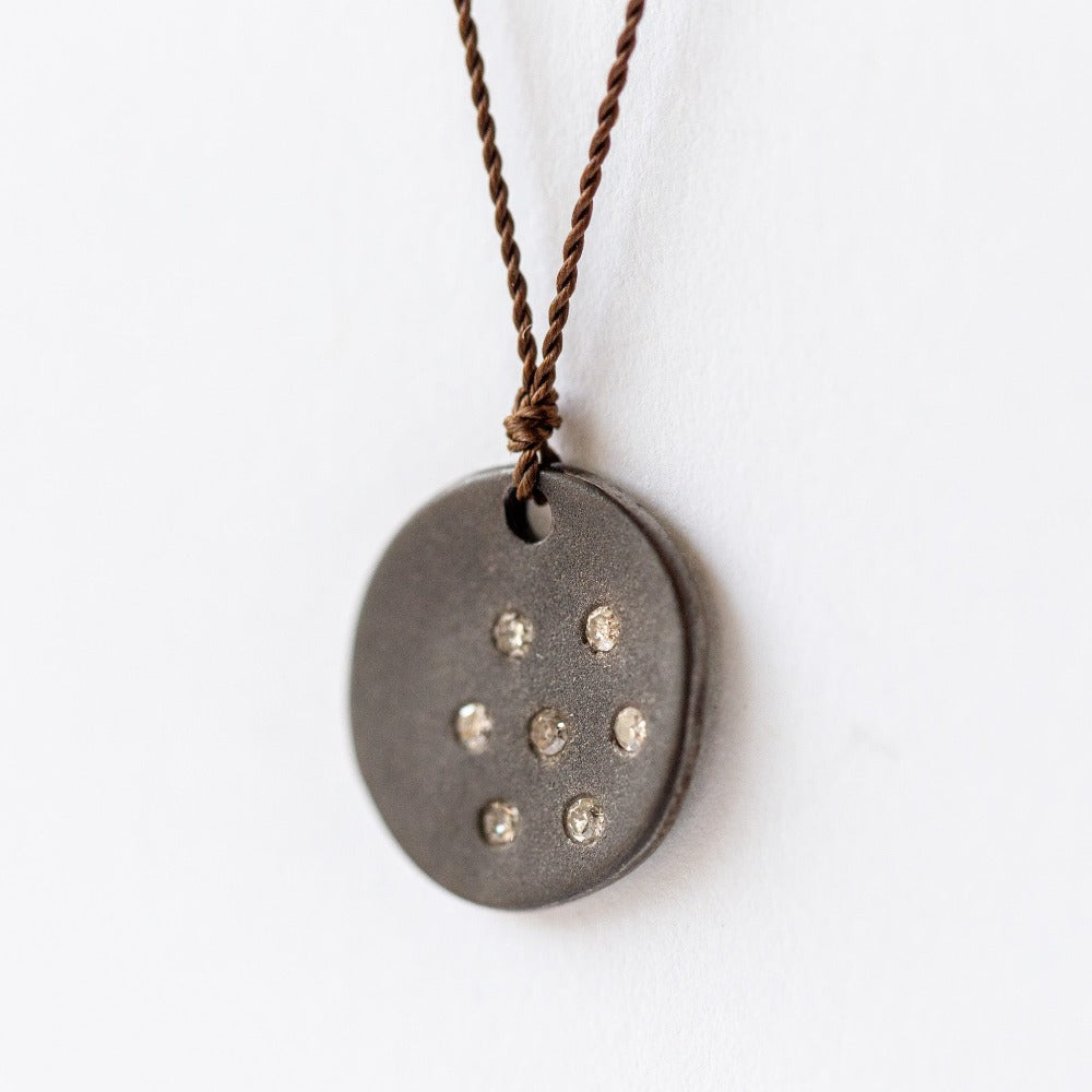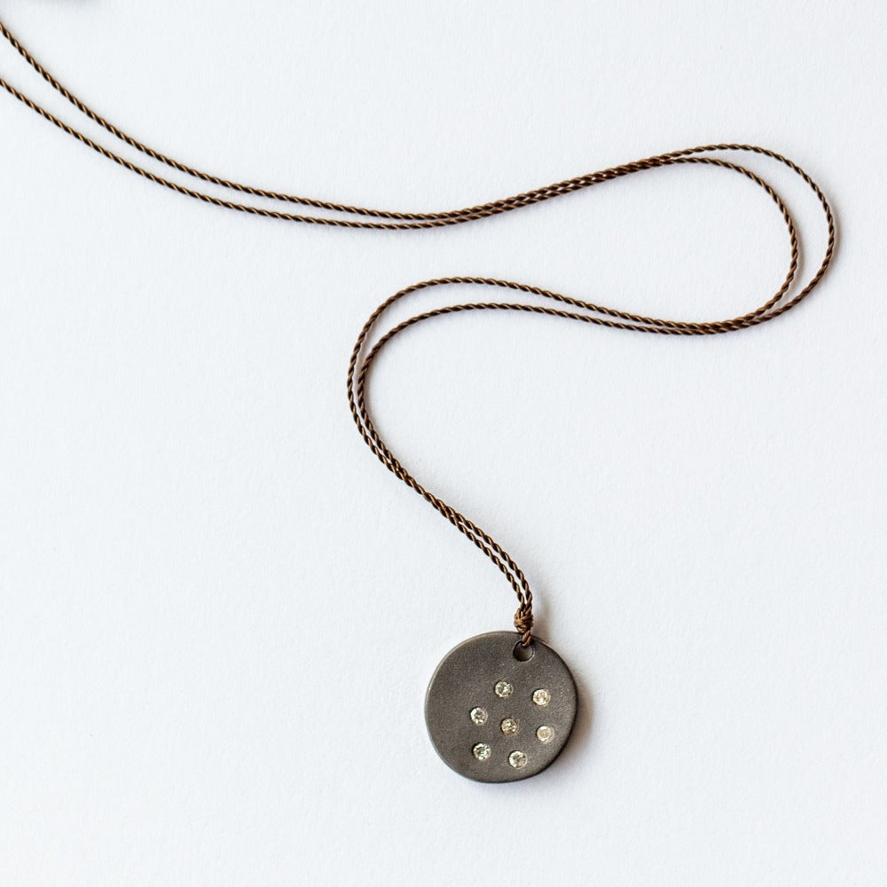 Blackened sterling silver disc with multiple diamonds necklace on a nylon cord