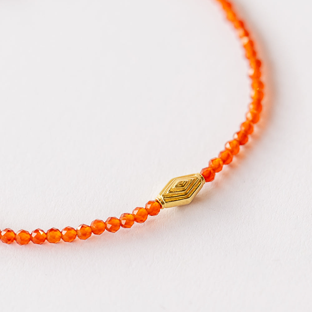Bright, warm carnelian beads catch the light alongside a ridged, diamond-shaped 18k gold bead for a subtle pop of luxe. Carnelian is said to boost motivation and creativity, making this bracelet a little wrist-side energy boost. Wear it stacked with other bracelets or let it stand alone—effortless style with just the right hint of flair.
