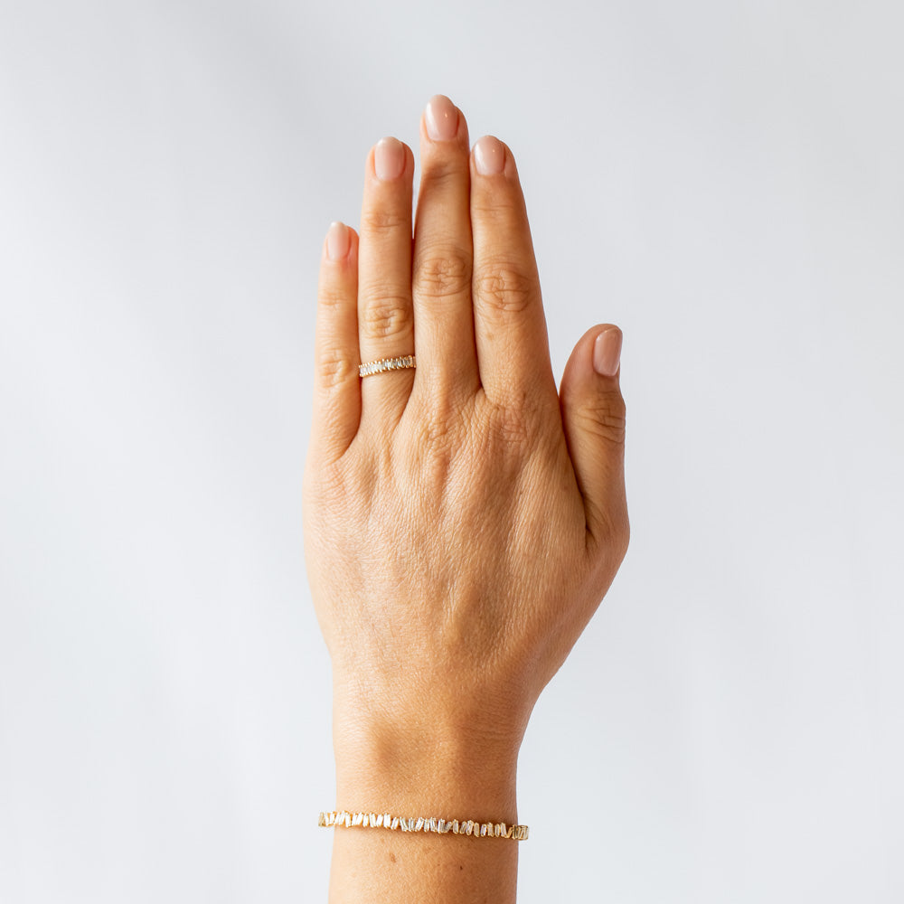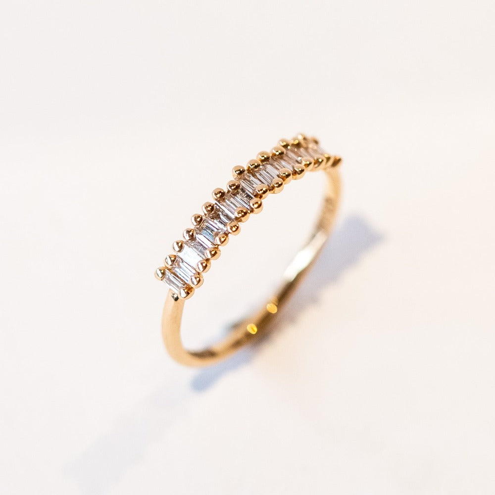 The Classic Diamond Stacker Band is a long time fan favorite. Made with 18-karat gold and baguette diamonds which are set unevenly, this is a simple ring that was designed for layering.