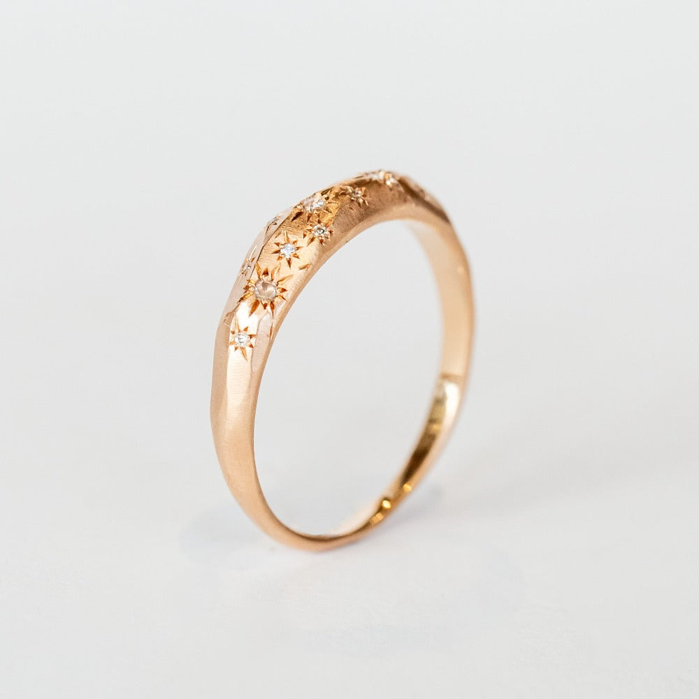 Etched stars nearly collide on this unleveled band. Carved with the roughness of a meteoric rubble, this piece surprisingly has a refined edge.