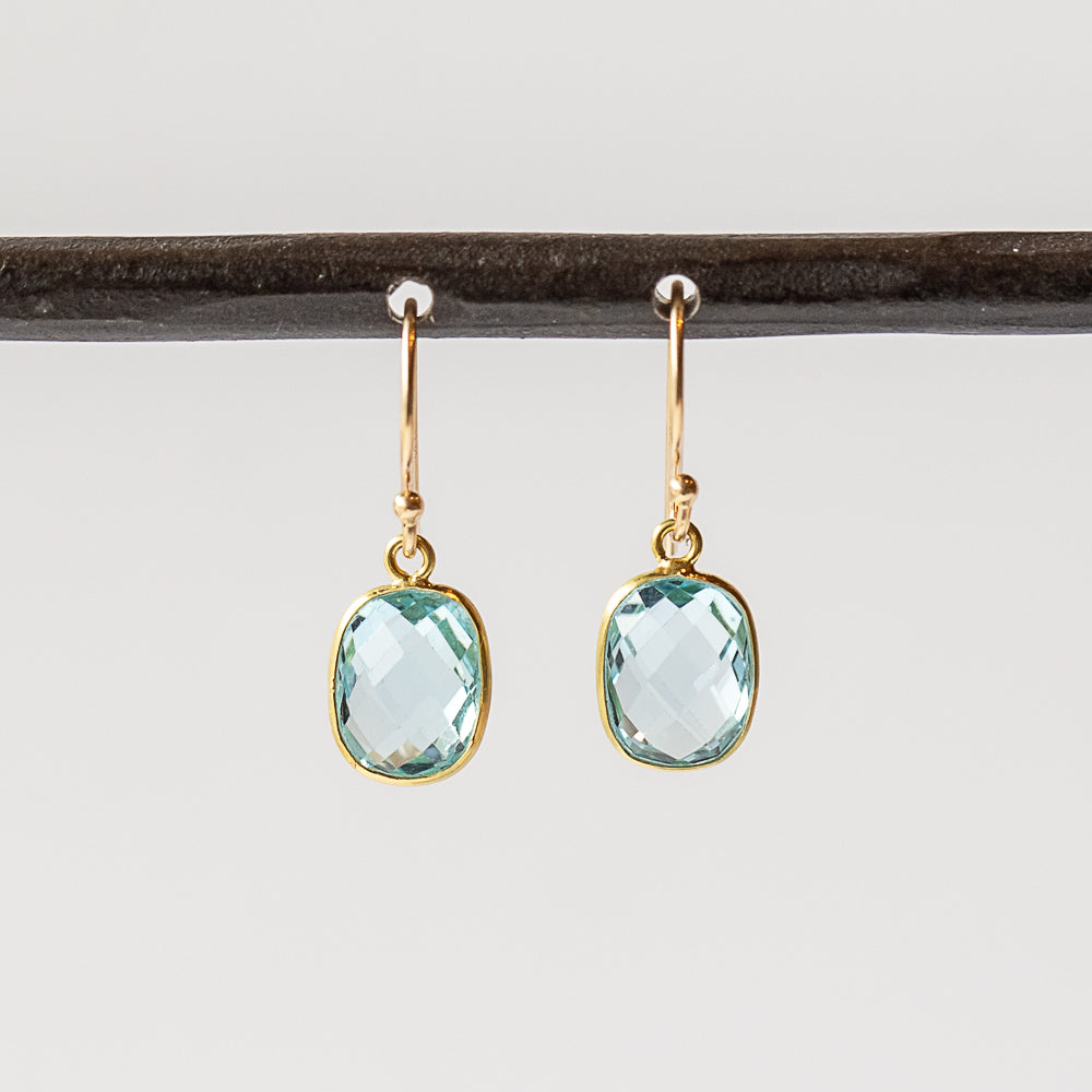 Bright and playful, these cushion-shaped, checkerboard-cut blue topaz drop earrings catch the light from every angle. Set in 18k yellow gold, their sparkling facets make them perfect for layering with your favorite gold hoops or wearing solo for a pop of cool color.