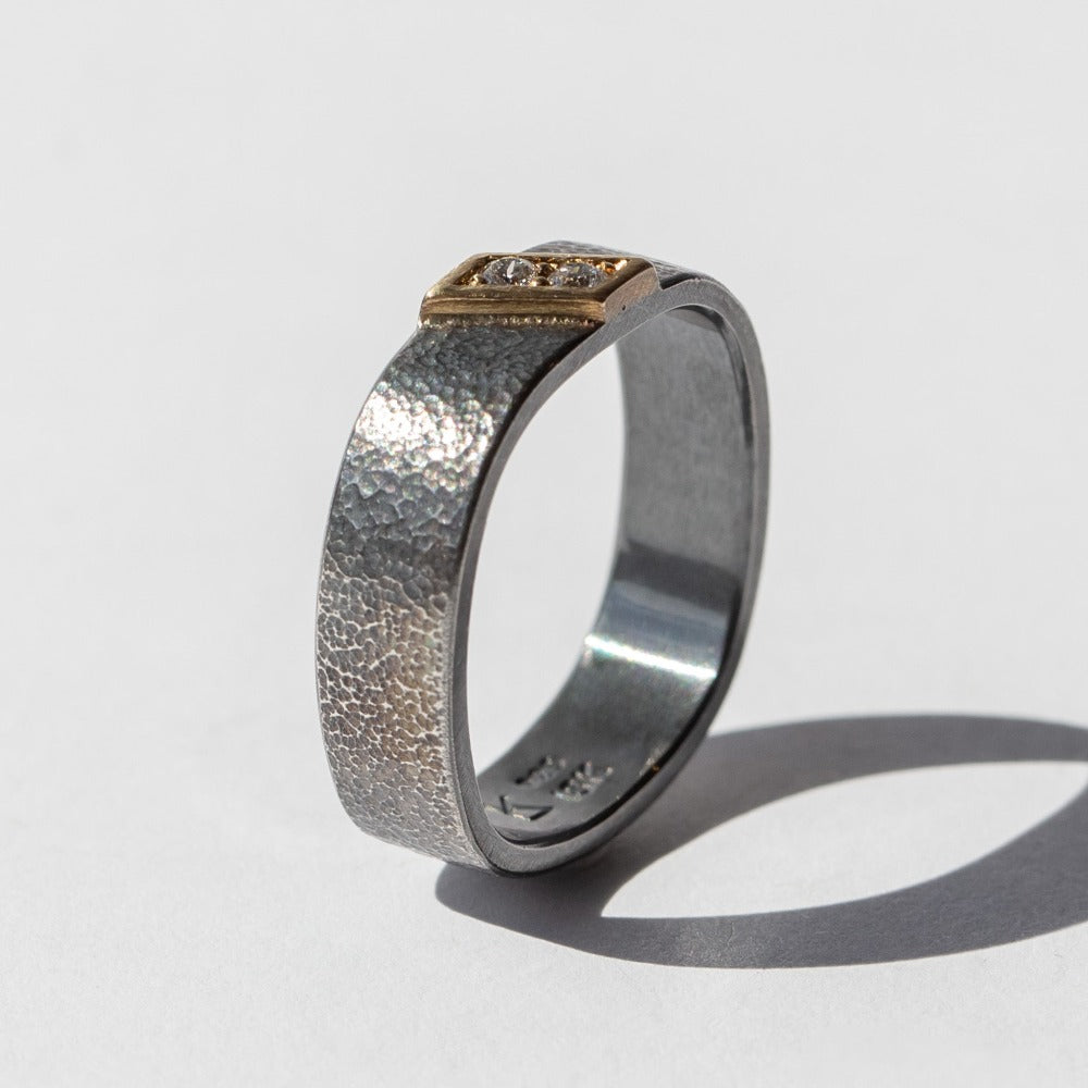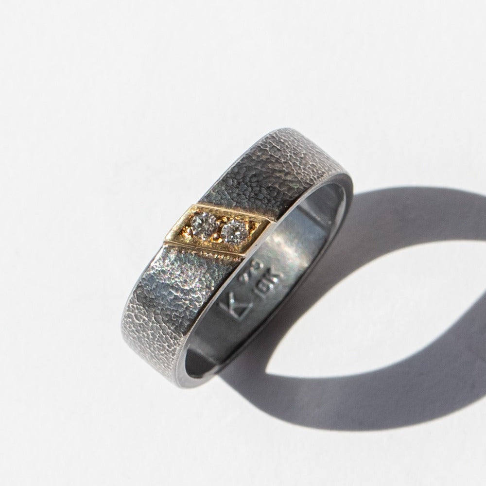 Textured oxidized sterling band with two flush white diamonds set in 18k yellow gold