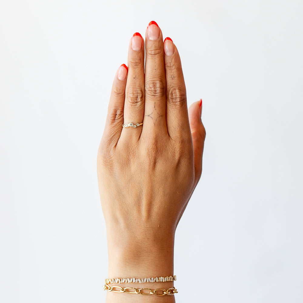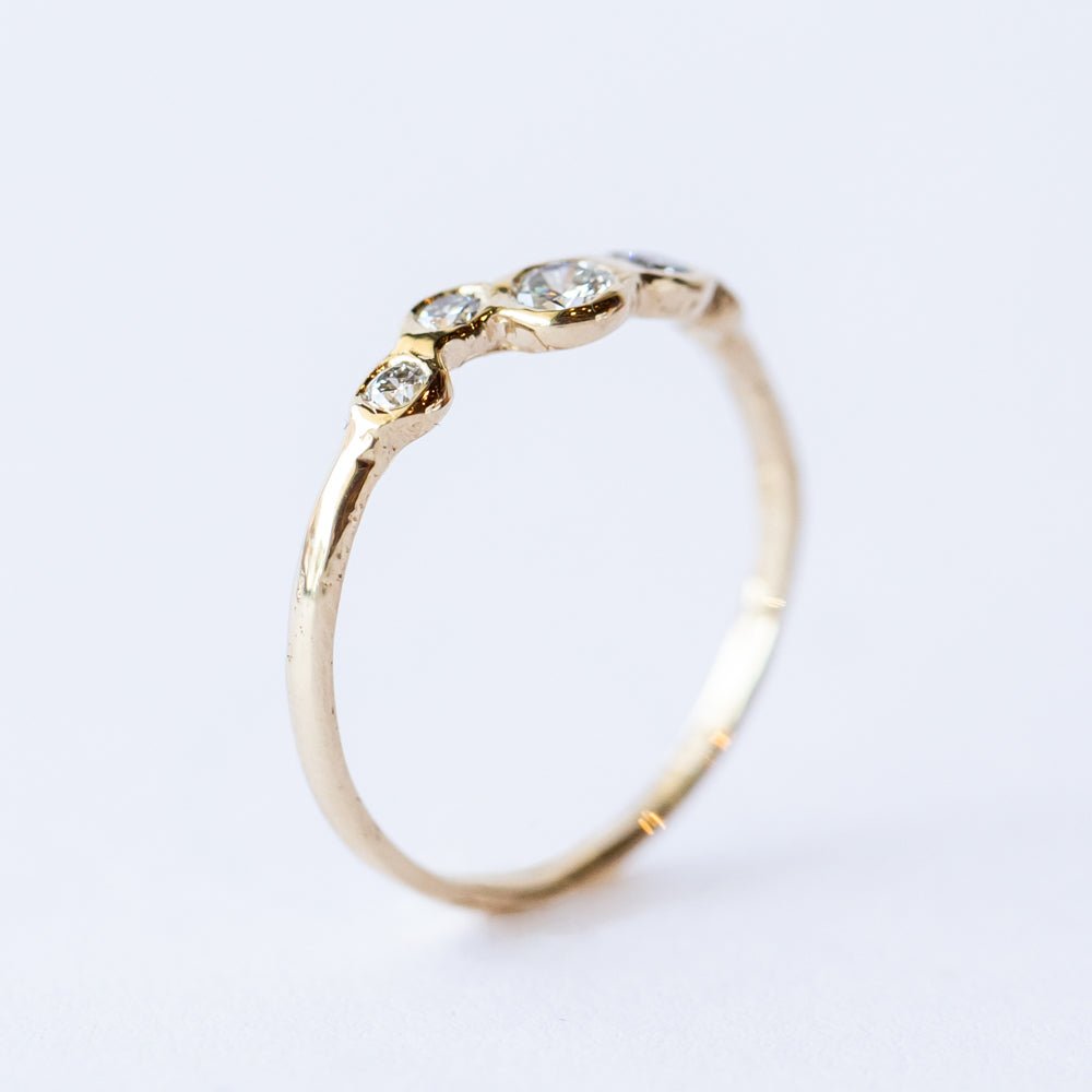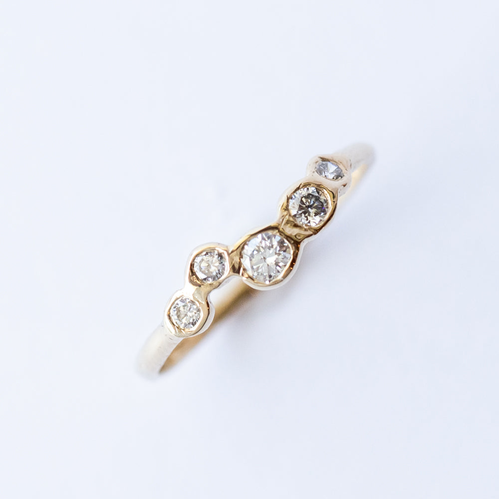 A fresh take on a classic diamond band, we're a little bit in love with this Misa Effervescence diamond ring. Think ocean bubbles, clinking champagne flutes, and the kind of sparkle that makes you feel fizzy inside. Five white brilliant-cut diamonds in slightly varying sizes float across a slender 14k yellow gold band, each one set just slightly off-center for a beautifully organic, wave-like effect.