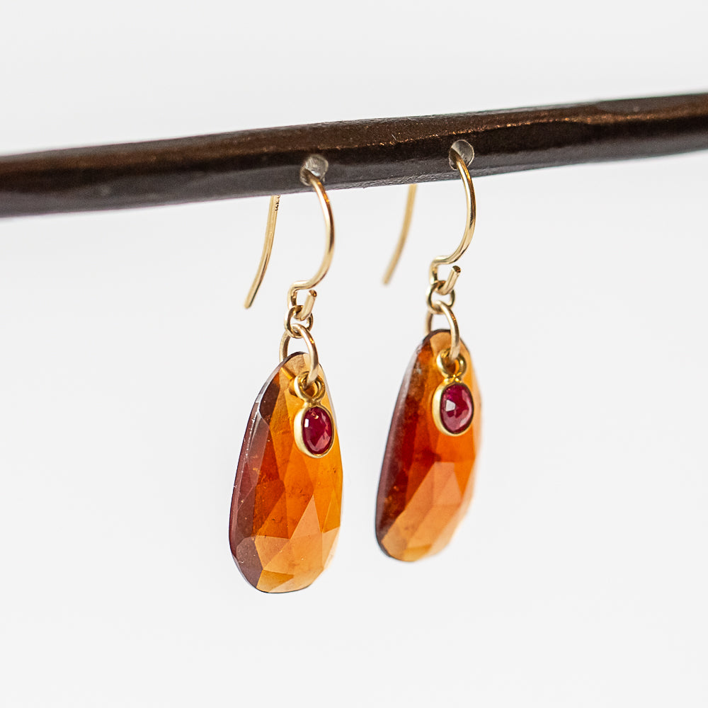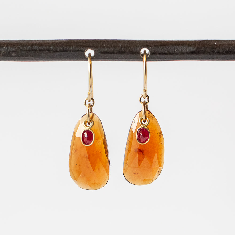 Margaret Solow | Elongated Asymmetrical Hessonite Garnet Drop Earrings with Tiny Ruby Dangles