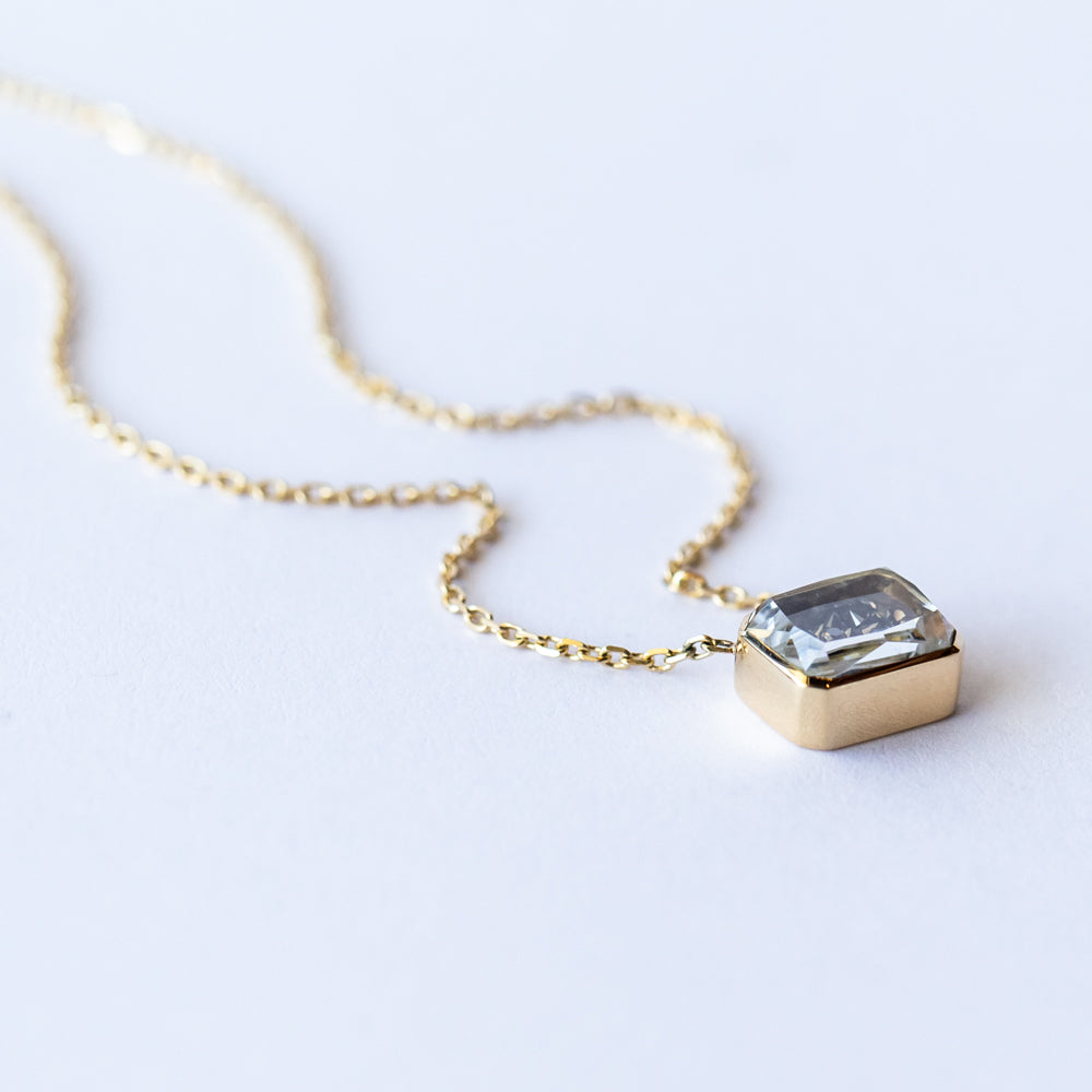 Dark and magnetic, the Esmeralda Necklace from Moritz Glik gives any outfit a modern edge, with its sleek horizontal rectangular shaker. Black diamonds swirl inside a white sapphire capsule, catching light with every move—perfect if you’re all about subtle sparkle with a twist. Set in polished 18k yellow gold, this piece sits confidently at the center of your look (no sliding here), making it a killer focal point whether layered or worn solo.