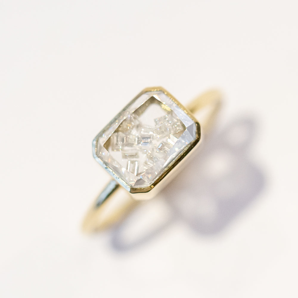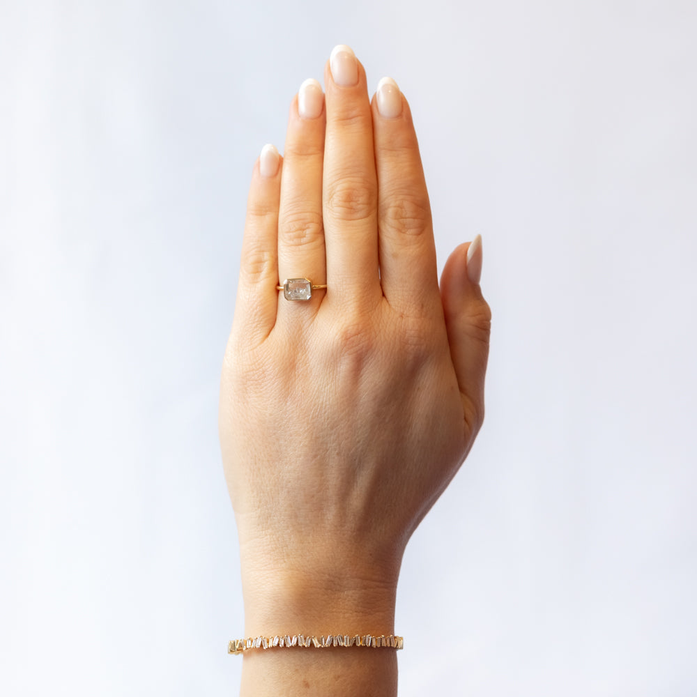 It’s a dream ring for April babes (diamonds are your birthstone!) or anyone drawn to clarity, light, and a little unexpected glamour. Wear it alone for maximum impact, or stack it with clean bands to keep the spotlight on that mesmerizing shaker.