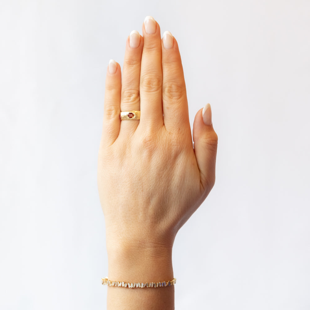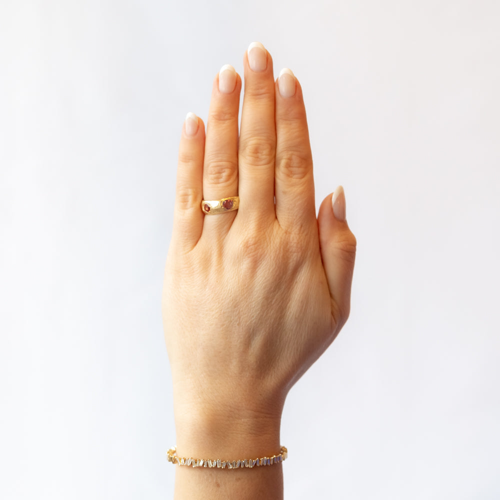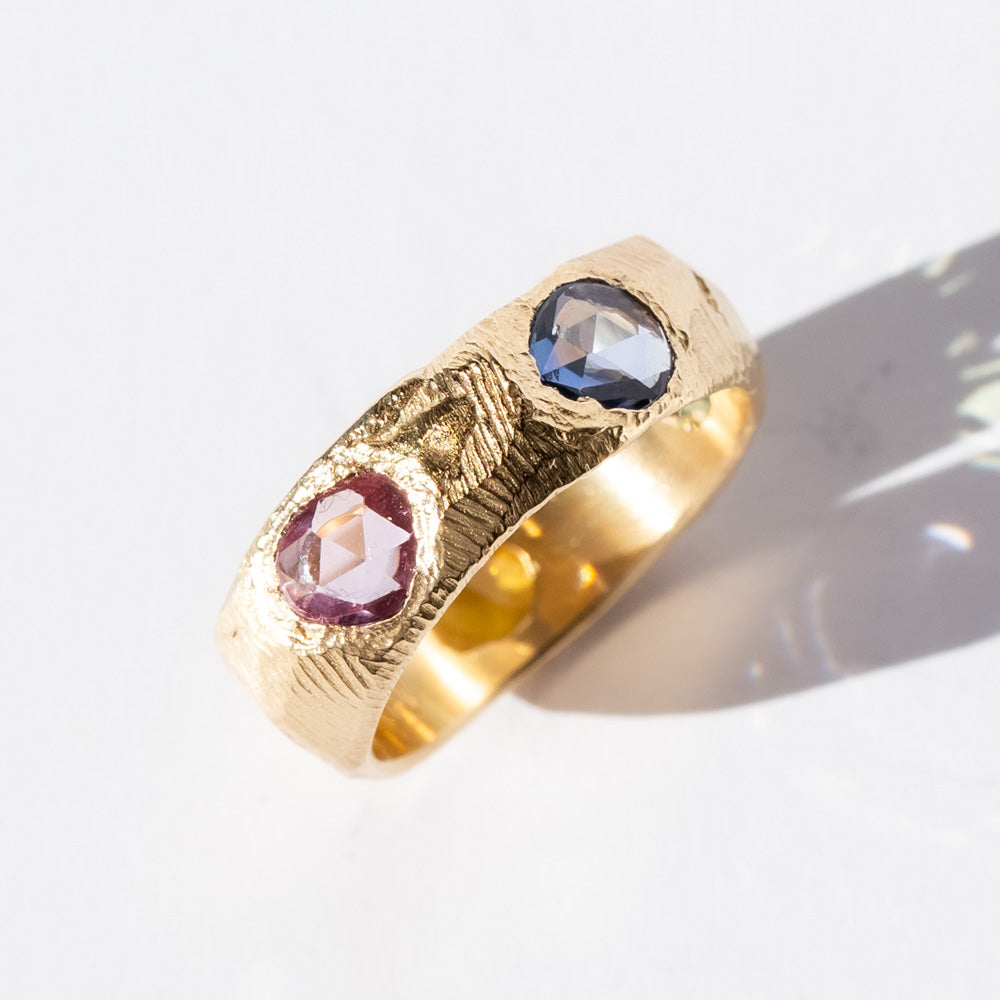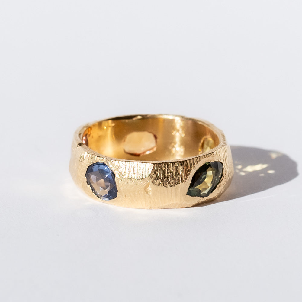 A bold and colorful statement, this rainbow sapphire ring is both striking and unique. Five rainbow sapphires, in a stunning array of vibrant hues, are beautifully set in a wide gold band to catch the light from every angle. The rich, intricately carved gold band adds texture and depth, making this ring feel like a work of art. With its vibrant color and strong design, this piece is perfect for those who want a truly standout ring that combines luxury and personality. Rainbow sapphires are known for their vibrant energy and are said to inspire joy, creativity, and optimism.