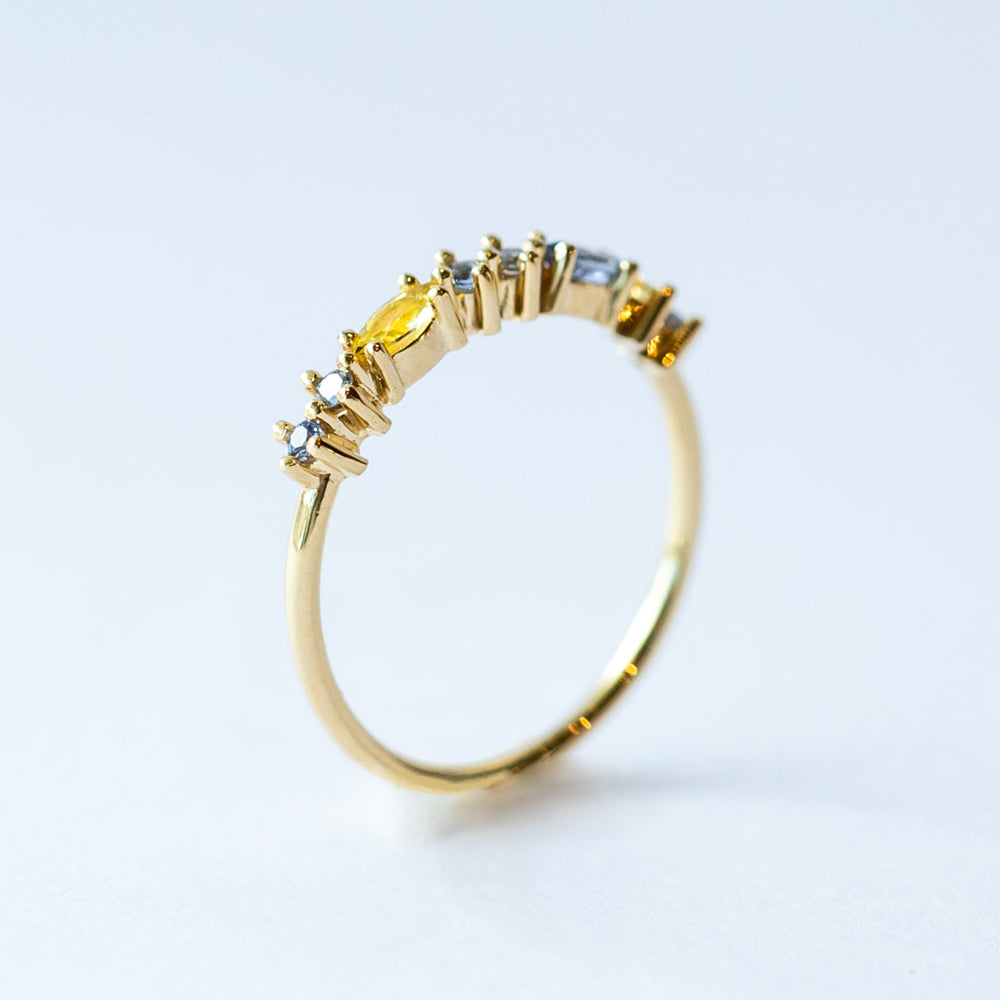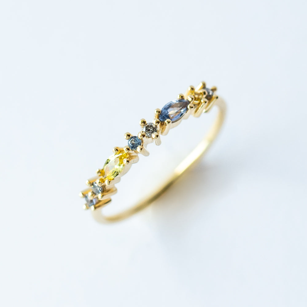 This stunning Sophie d’Agon gemstone ring is pastel poetry in a band—dreamy, delicate, and just a little bit rebellious. Set in 18k yellow gold, this softly glowing piece combines cool-toned light blue and yellow sapphires with glittering salt and pepper diamonds for a vibe that’s equal parts romantic and unexpected.