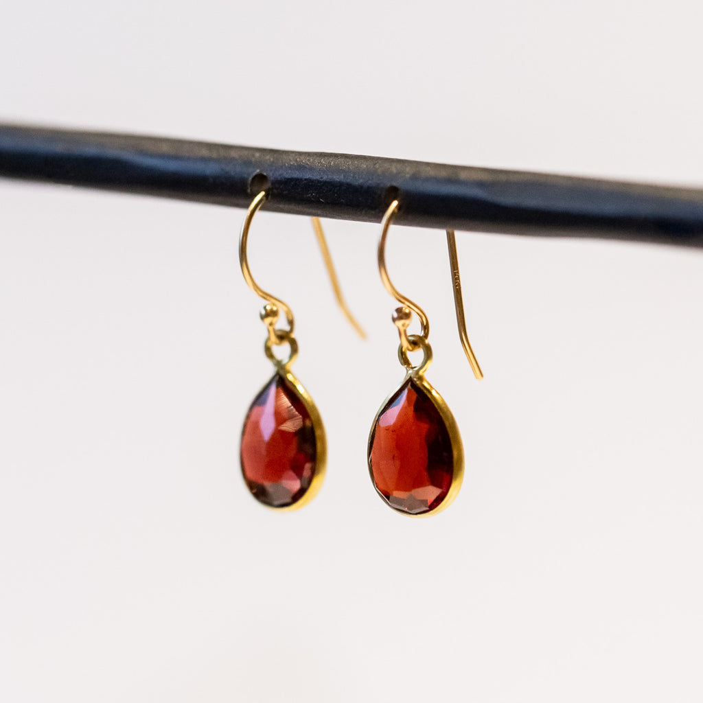 Teardrop faceted garnet drop earrings bezel set in 14k yellow gold