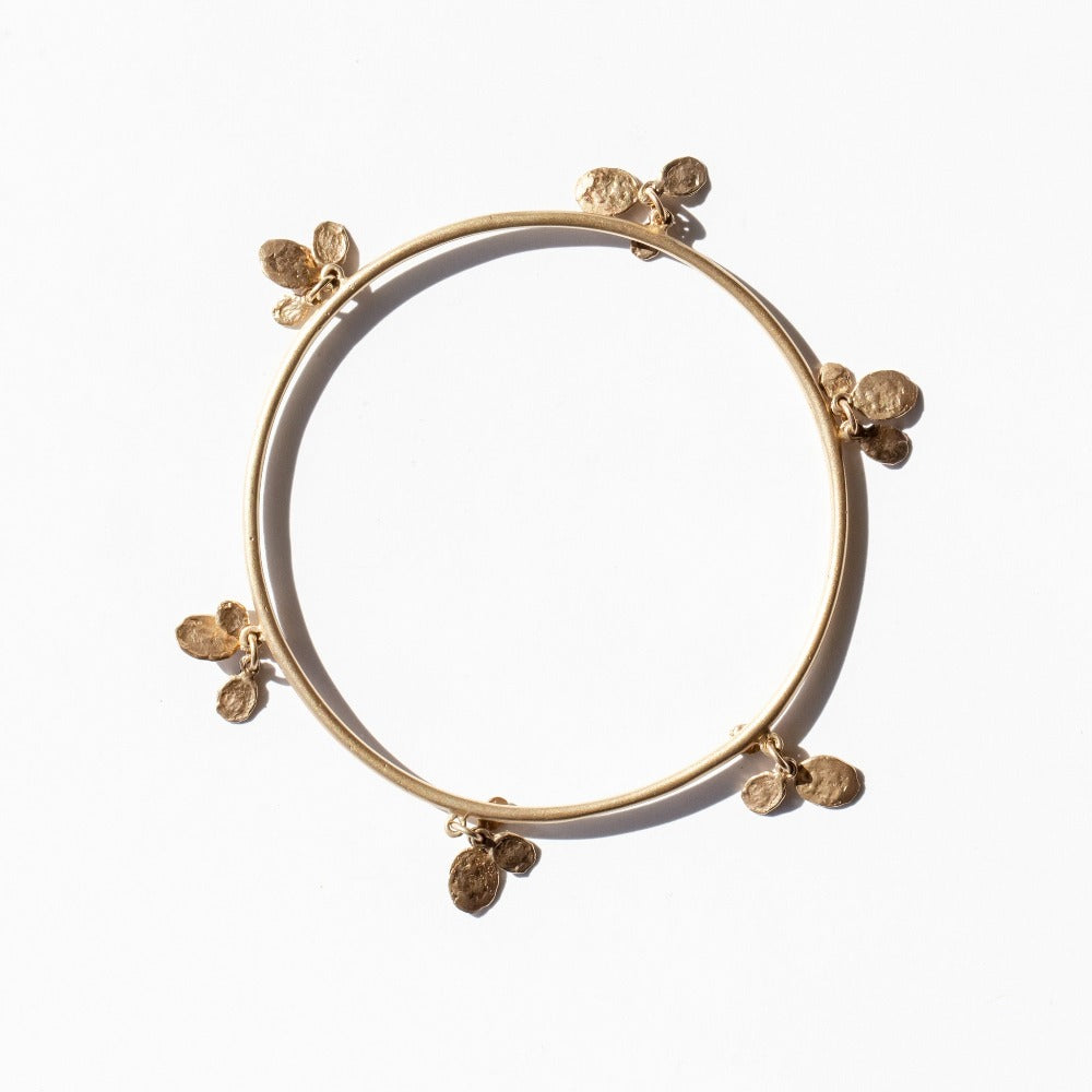 Hammered bangle in 14k yellow gold with dangling flake detail