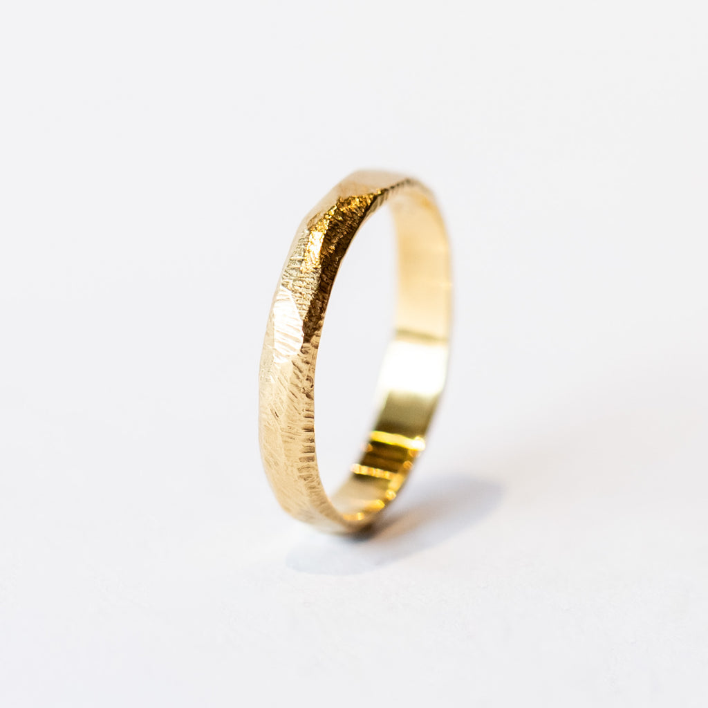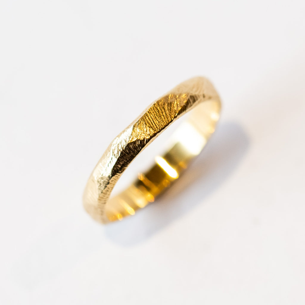 A perfectly unique wedding band made just for you, no two rings are exactly alike. This 4mm wide ring features Page's signature carved texture with a brushed satin finish, made in 18k yellow gold.