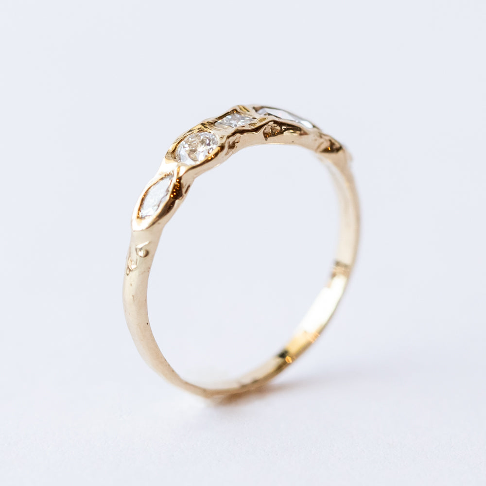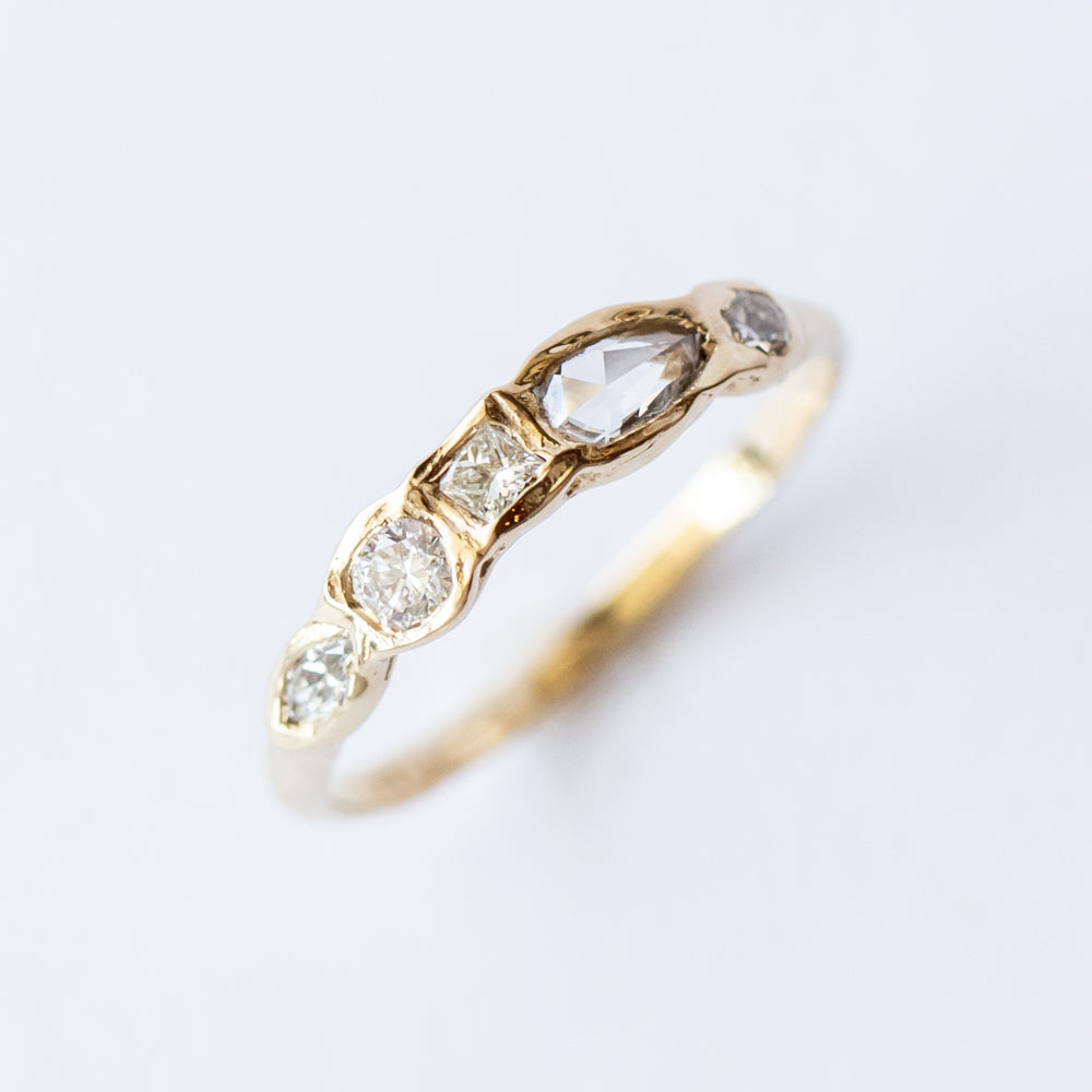 A sparkling tribute to life’s twists, turns, and triumphs, the Journey Treasure Diamond Ring by Misa tells a sparkling story. Set in 14k yellow gold, this ring features a thoughtfully asymmetrical mix of diamond cuts—round brilliant, rose-cut pear, princess, and marquise—creating a beautiful journey across a delicate, organic band.