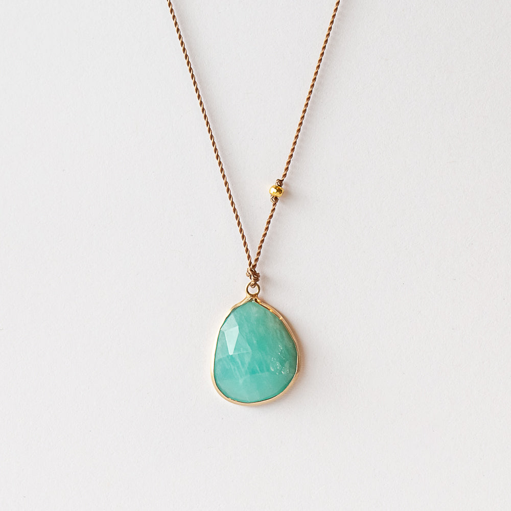 Cool, calm, collected—that’s the vibe of this striking amazonite pendant. Its asymmetrical cut feels effortlessly modern, giving the soft sea-green stone a little edge. Bezel-set in 14k yellow gold and strung on a minimalist nylon cord, it’s the perfect mix of natural and refined.