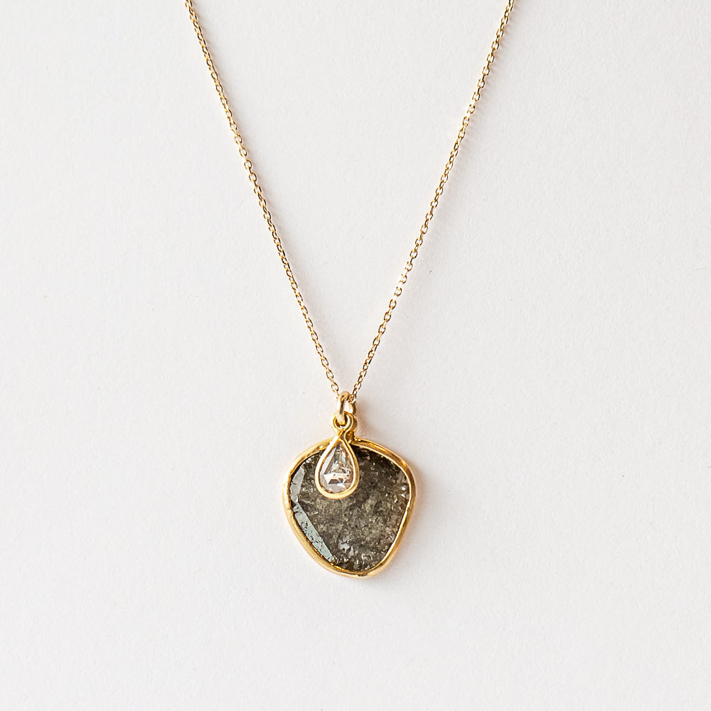 Edgy meets elegant—this asymmetrical diamond slice necklace is all about unique sparkle. The speckled diamond is bezel-set in 18k yellow gold, accented with a tiny teardrop diamond dangle, and hangs from a 14k yellow gold chain adjustable from 16 to 18 inches.