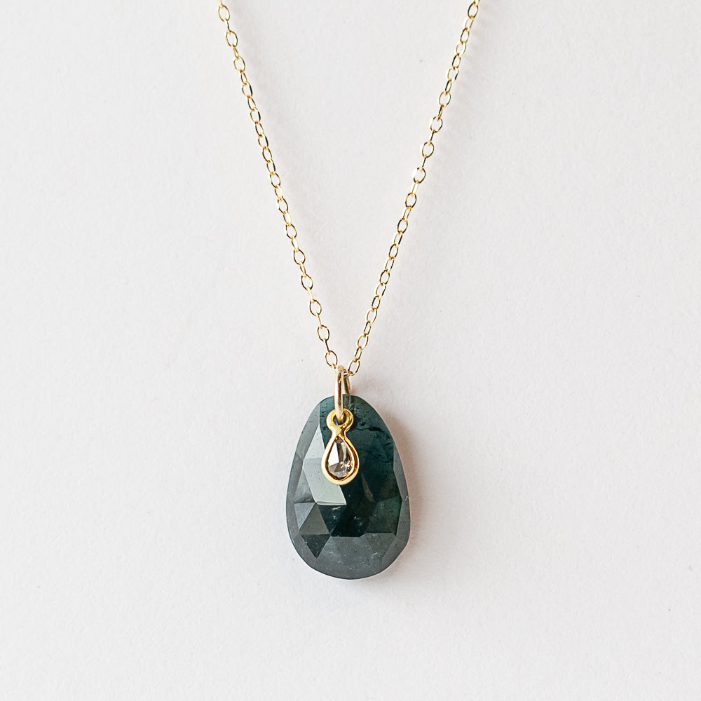 Moody and mesmerizing, this deep blue-green tourmaline necklace gives statement vibes with subtle sparkle. The faceted teardrop tourmaline is accented with a tiny diamond dangle and hangs from an adjustable 14k yellow gold chain.