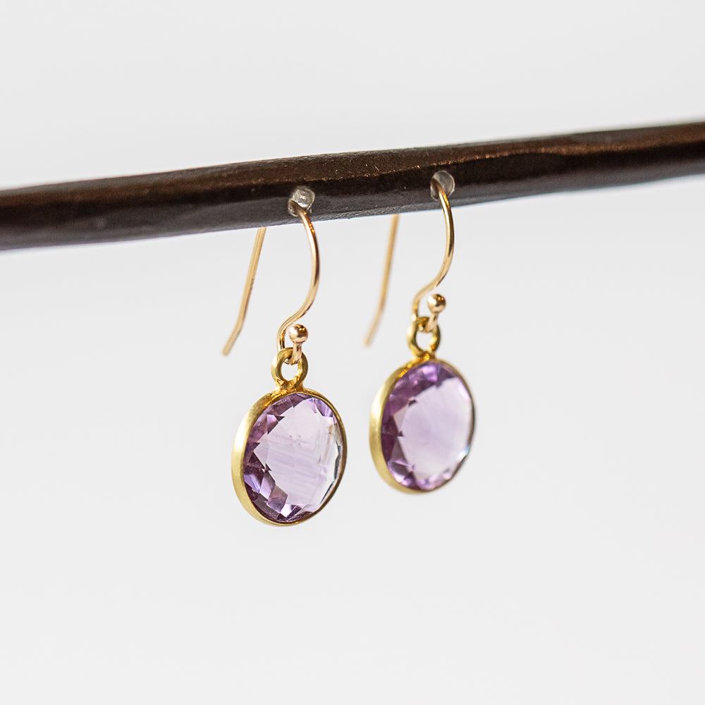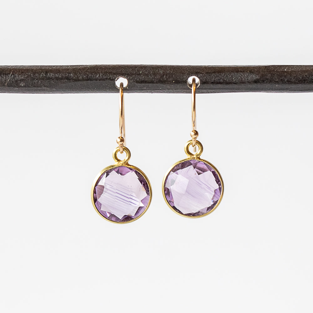Add a pop of calming violet to your jewelry rotation with these round amethyst drop earrings. Bezel set in 18k yellow gold, they’re sleek, modern, and effortlessly wearable.