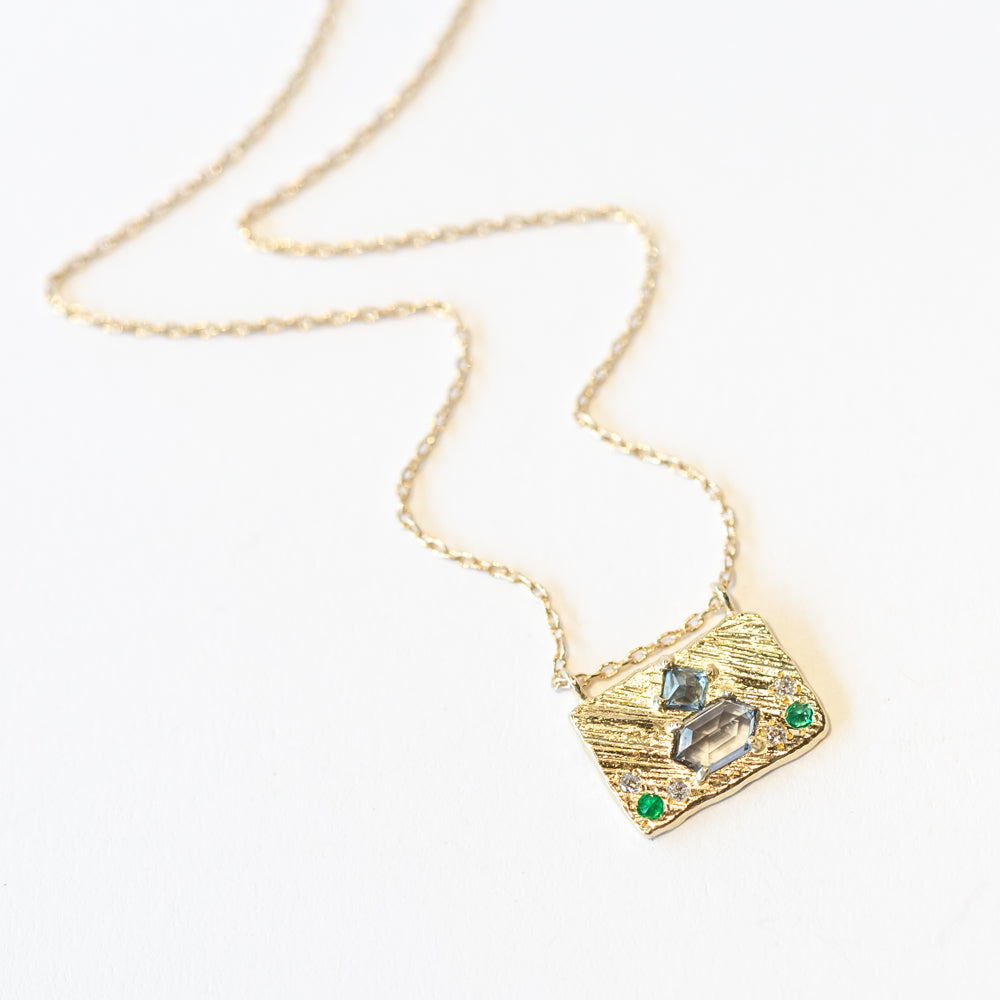 This 14k yellow gold necklace is a little work of art, bringing together color, texture, and just the right amount of sparkle. The hand-carved pendant has an organic, shimmering style. Prong-set within the textured gold, blue spinels, vibrant emeralds, and shimmering diamonds create an effortless mix of color, shape, and light. Suspended from a delicate 16-inch chain, this piece is perfect for layering or wearing solo when you want a touch of understated brilliance with an artful edge.