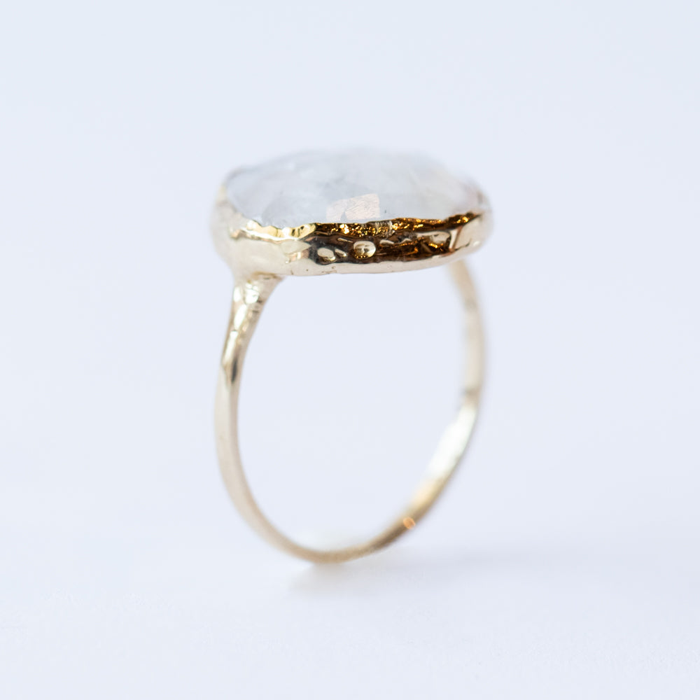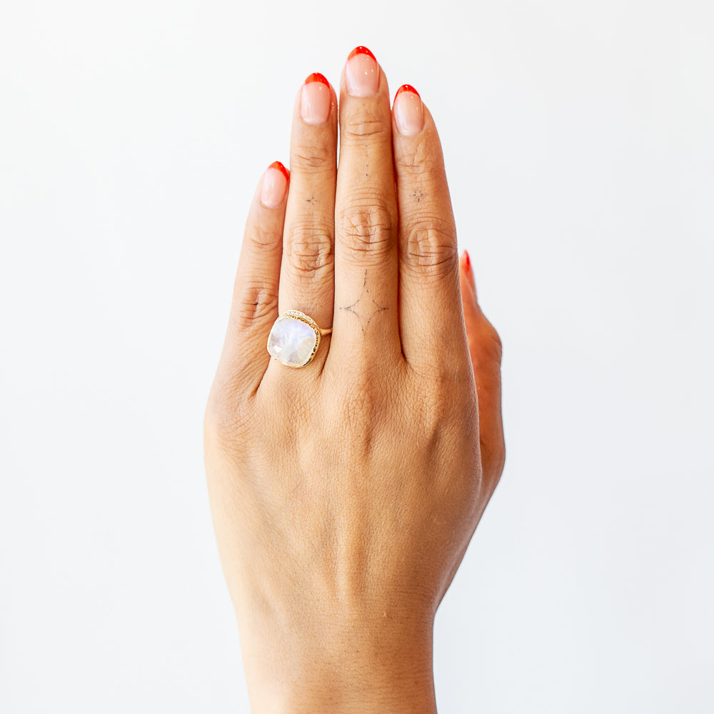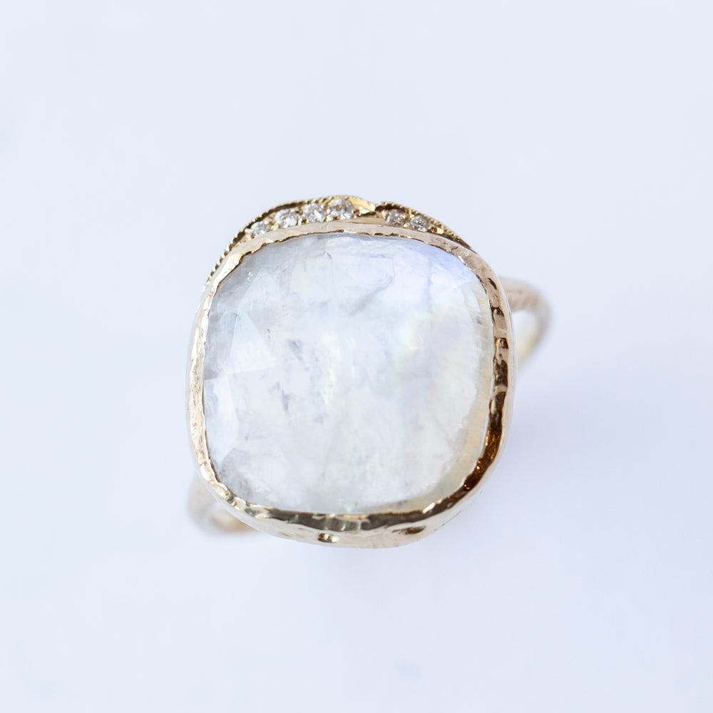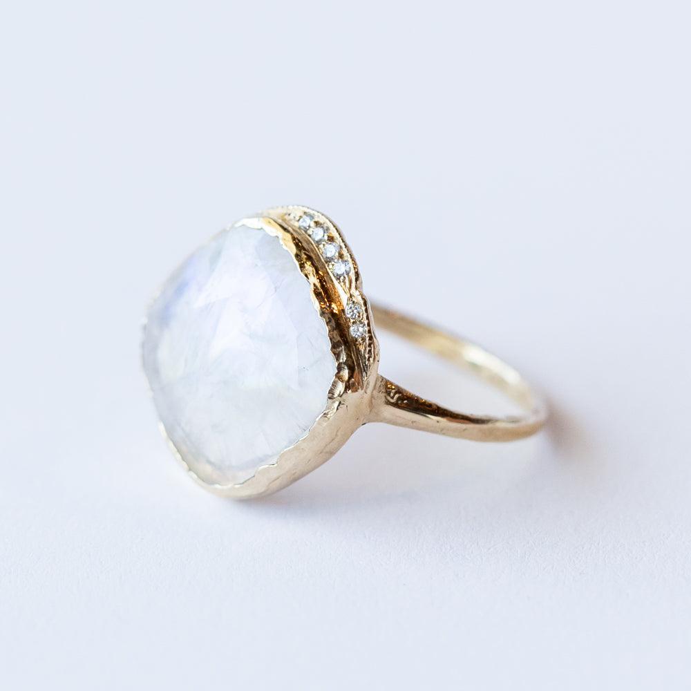 Dreamy, luminous, and a little otherworldly—this Moonstone Cove Ring brings serious goddess energy to your ring game. A softly iridescent moonstone is framed in hand-sculpted 14k yellow gold while a slender swath of pavé white diamonds adds a subtle sparkle.