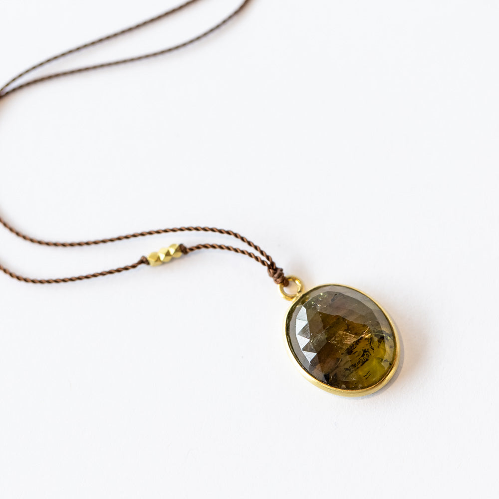 Oval faceted mossy green tourmaline necklace on a nylon cord