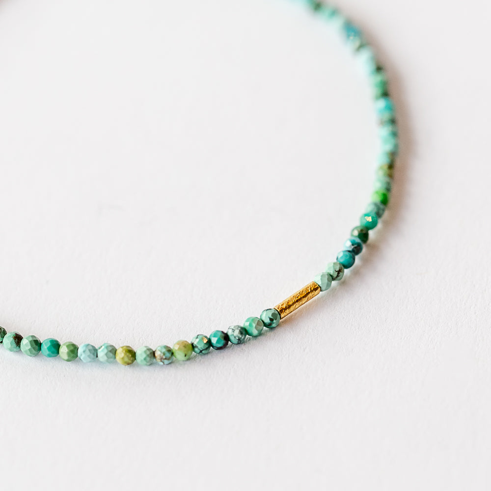 This playful strand from Margaret Solow brings together a mix of turquoise hues, accented with a sleek 18k yellow gold tube bead. Turquoise, December’s birthstone, has long been treasured as a talisman of luck, protection, and easygoing joy. The rainbow of shades makes it endlessly versatile—layer it with other bracelets for a stacked look, or wear it solo for a subtle pop of color that channels both boho and refined energy.