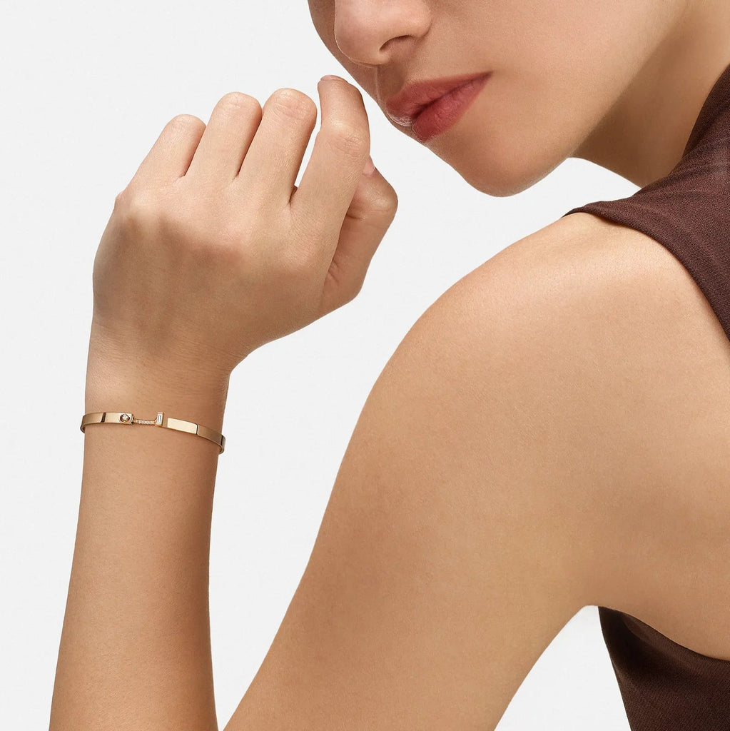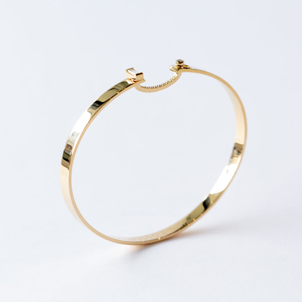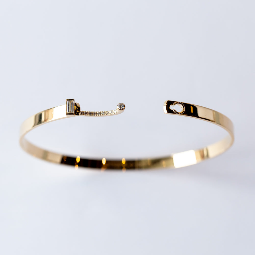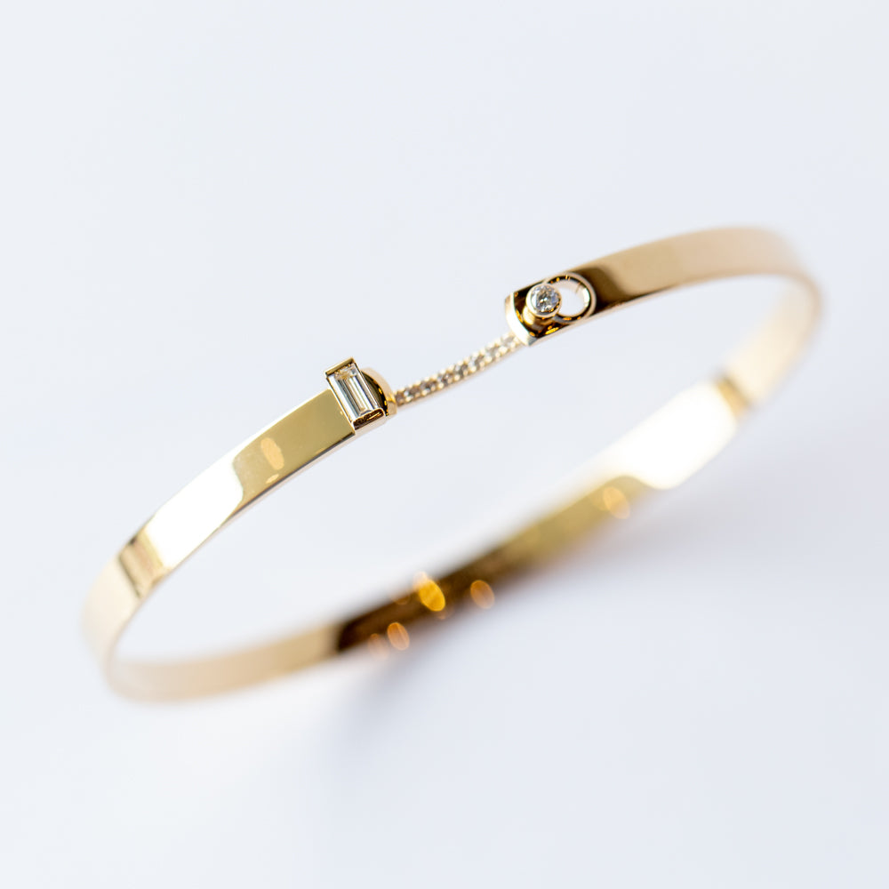 Simultaneously minimalist and precious, the Dinner Date Mood bangle revisits the baguette-cut diamond in an ultra-modern way. Drawing inspiration from the aesthetic codes of the punk movement, it revisits the piercing as its signature closure set with a delicate line of brilliant-cut diamonds and a baguette-cut diamond. An everyday statement, the 18k gold bracelet is crafted to the highest standards of French savoir-faire with a subtle oval shape that is as chic as it is comfortable, making it easy to wear alone or mix with other favorites.