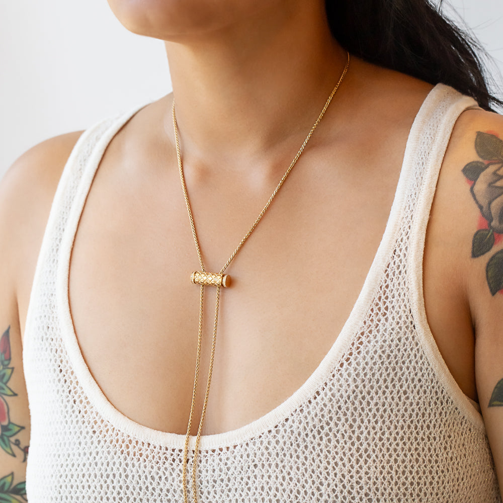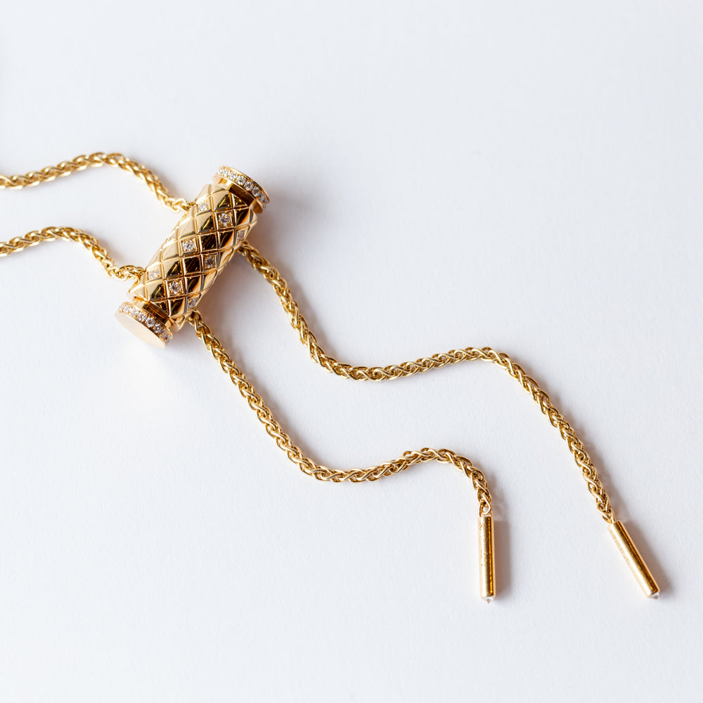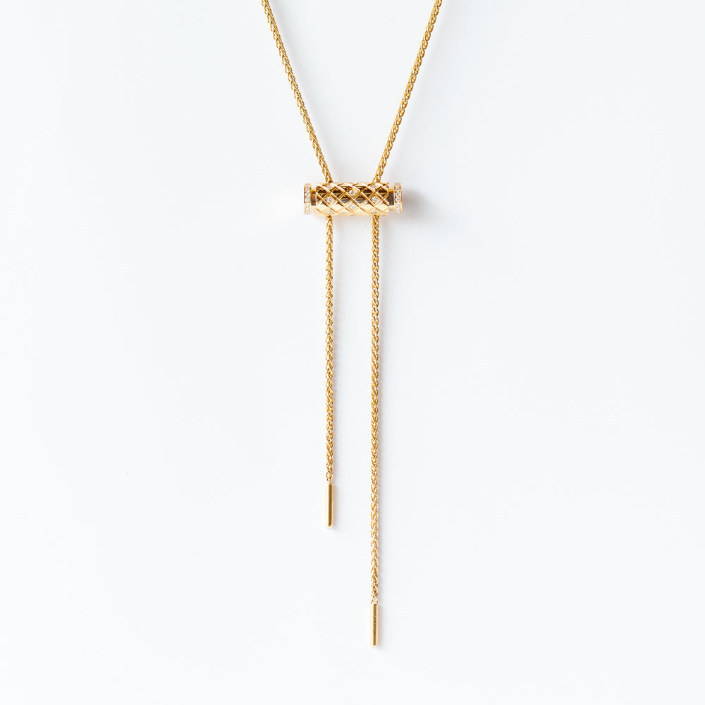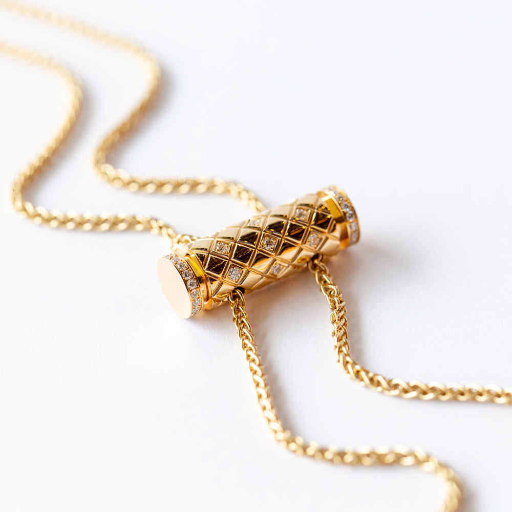 French savoir-faire embraces street style in the Latch collection. Each pendant intertwines delicate details with a modern edge. Set with semi-pavé diamonds, this gold pendant introduces a unique design twist: pinch the sides, slide into place on a Latch chain, and release to secure. Versatile, this pendant compliments the various chains of the collection.