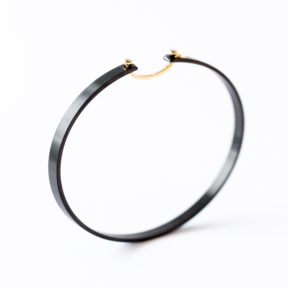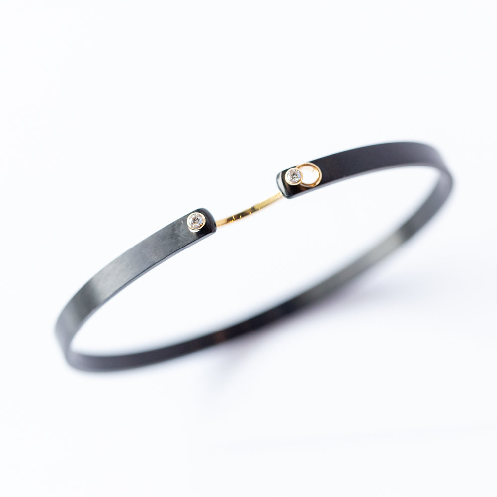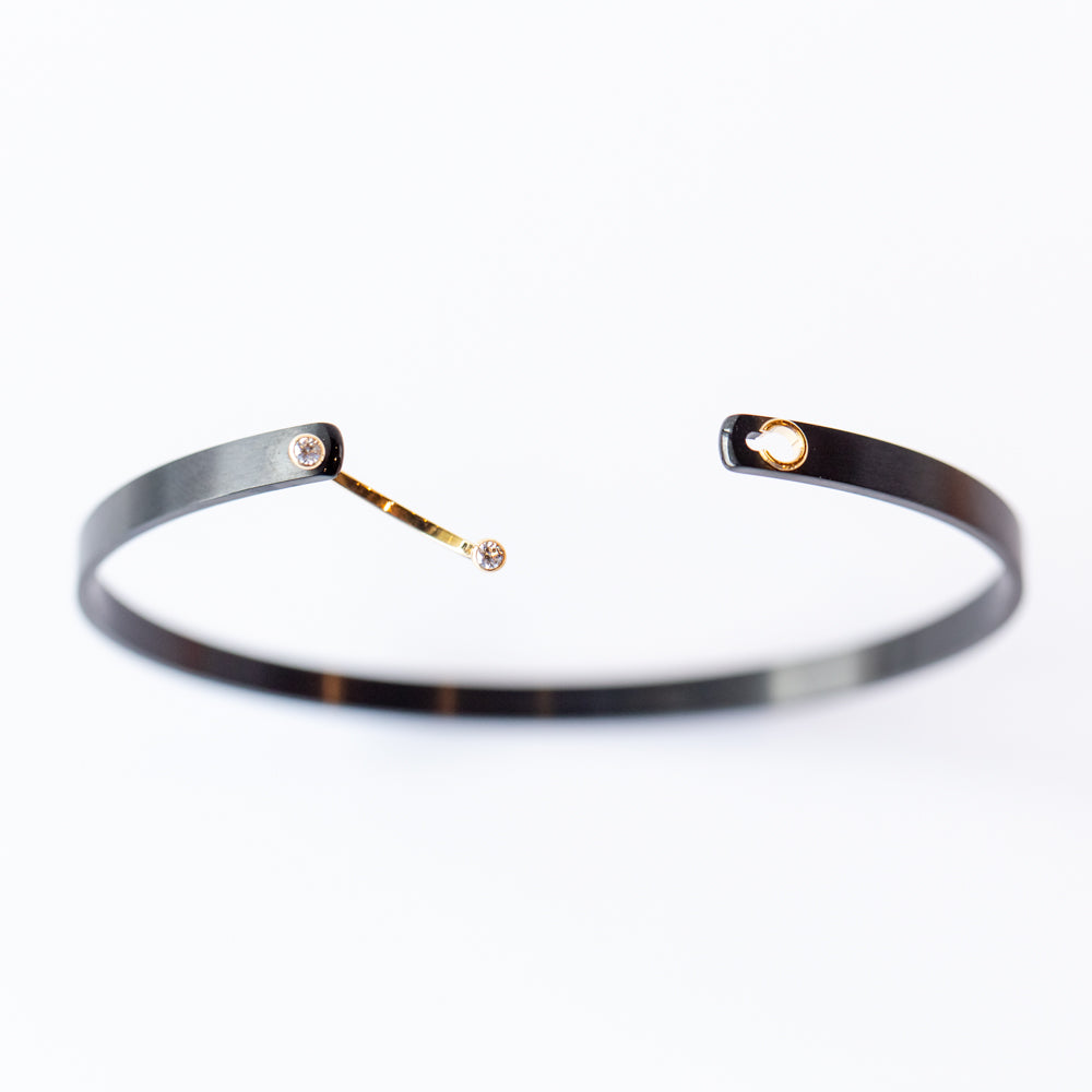 Made with titanium and 18k gold, the Midnight In Manhattan Mood Bangle's oval shape makes it comfortable. To highlight the bracelet's elegant oval shape, the Maison's craftsmen created contrast by using brushed polish on the outside and inside of the bracelet and mirror polish on the edges.