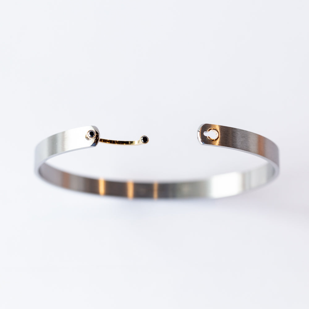 A modern, slightly wider twist on the Maison's icon, the Paris From The Sky 6mm Mood bracelet complements its sister bangles with a brushed, matte finish and two brilliant-cut diamonds set on its signature 18k gold piercing closure. Gold accents elevate a sense of contrast on this timeless, minimalist essential, whether worn alone or stacked with other favorites.