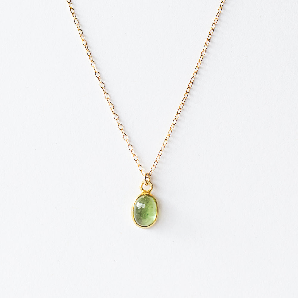 Tourmaline, a birthstone for October, is also the perfect pop of color for anyone who needs it. This bright green baby, cut in a smooth cabochon oval, is bezel set in warm 18k yellow gold and strung on a classic 14k yellow gold cable chain. The adjustable length makes it perfect for a variety of necklines and layering with other chains and necklaces in your collection.