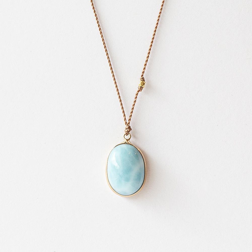 This oval larimar pendant brings chill, beachy vibes to your everyday rotation. Bezel-set in 14k yellow gold on an 18-inch nylon cord, it’s the perfect mix of natural texture and refined shine.