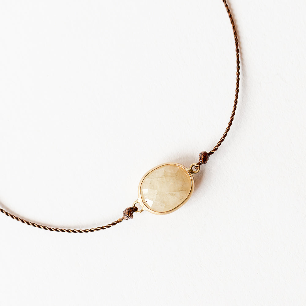 A soft linen-colored sapphire sits at the center of this minimalist cord bracelet, framed with a warm 14k gold bezel. Sapphires, September’s birthstone, are connected to wisdom, clarity, and grounding energy—qualities that feel right at home in this subtle, neutral shade. Wear it alone for a whisper of color or stack it with brighter stones for contrast.