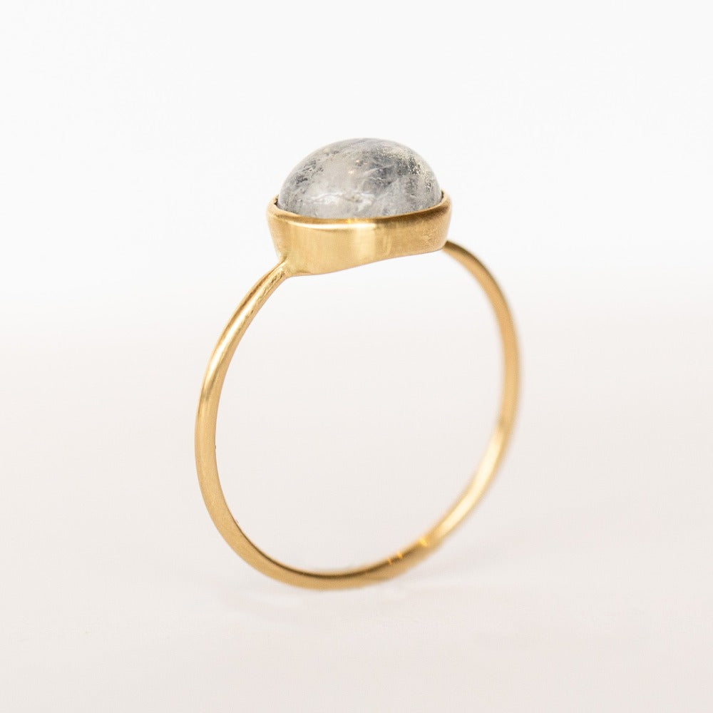 Cabochon rainbow moonstone ring bezel set in 14k yellow gold