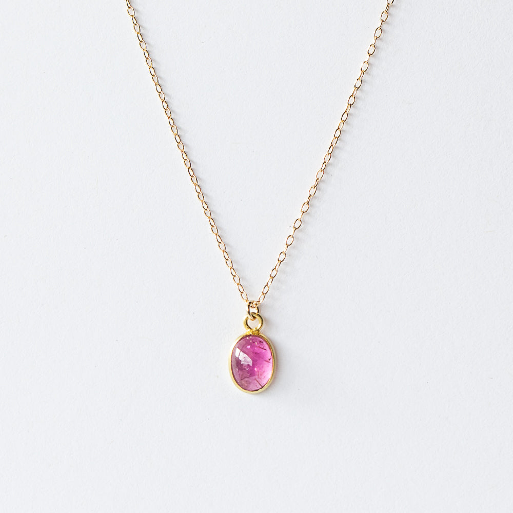 Bright, cheerful, and totally wearable—this dainty oval pink tourmaline necklace is a pop of color you’ll actually reach for every day. The cabochon pink tourmaline is bezel-set in 18k yellow gold and suspended from a delicate 14k yellow gold chain, adjustable from 16 to 18 inches for effortless layering or solo wear.