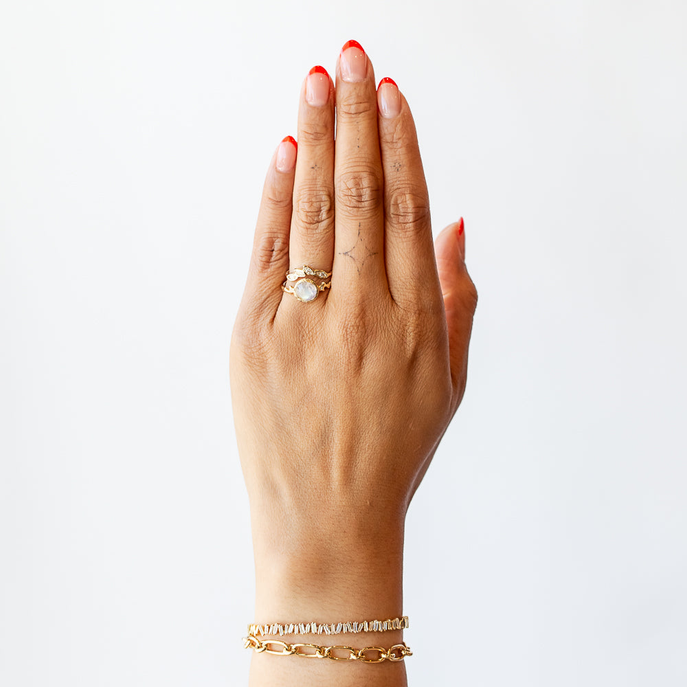 With serious shine, this diamond band delivers effortless cool vibes and subtle luxe. Whether you wear it solo as a sleek contour wedding band or stack it up for maximum impact, it’s your go-to for everyday glam that’s anything but basic.