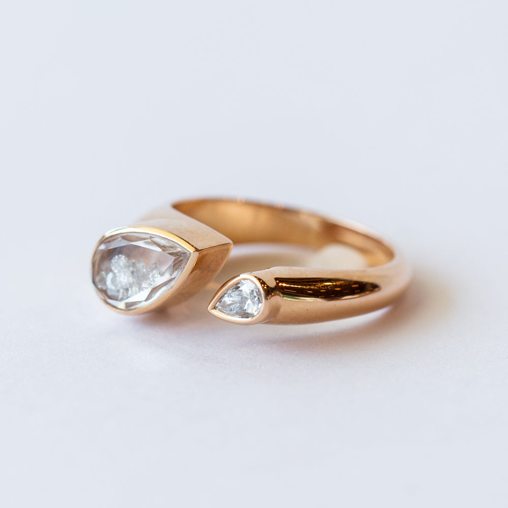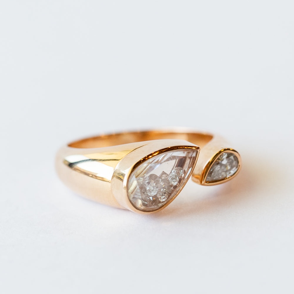 This open-style ring from Moritz Glik plays with symmetry in all the right ways—on one end, a pear-shaped white diamond; on the other, Glik’s iconic Kaleidoscope Shaker™ filled with free-floating diamonds sealed in a pear-shaped white sapphire capsule. It’s like a mirrored illusion of light, shimmer, and movement perched right on your finger.