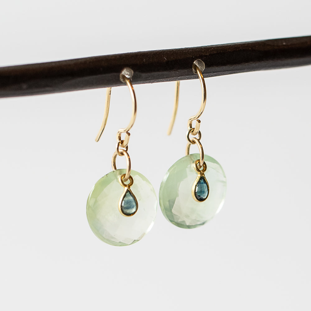 These earrings pair round checkerboard-cut prehnite drops with tiny sapphire teardrop accents, all bezel set in 18k yellow gold. The soft green prehnite pops with calming, heart-centered energy, while the sapphires add a hint of luxe and sparkle. Perfect for everyday wear, layering with your other favorite earrings, or making a quiet statement.