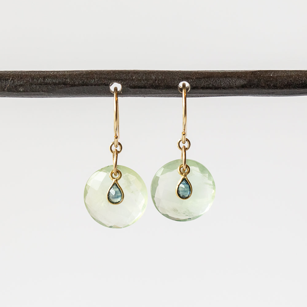 Margaret Solow | Round Checkerboard Prehnite Drop Earrings with Tiny Sapphire Teardrop Dangles