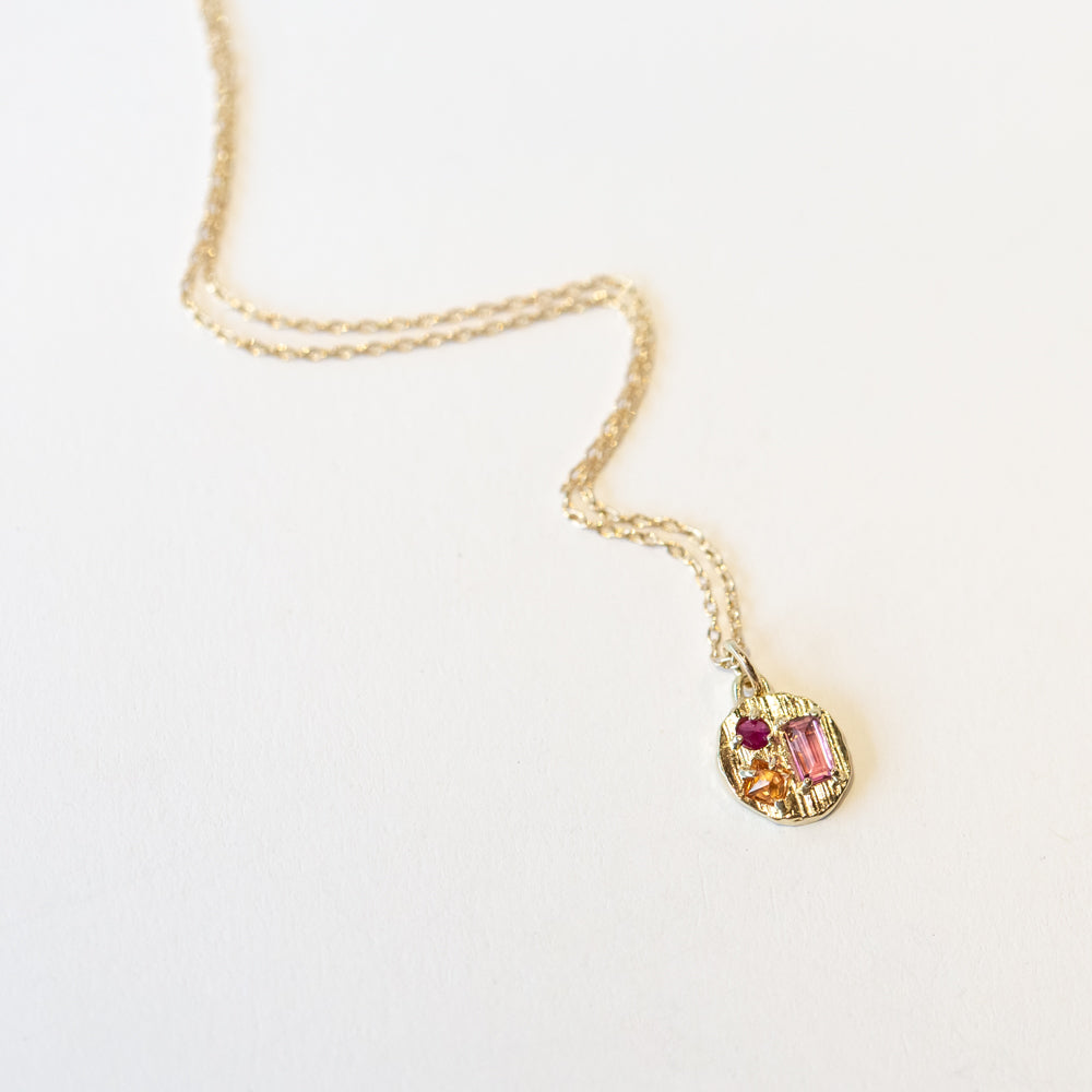 This 14k yellow gold necklace is a colorful celebration of gemstones and texture. The round pendant features a hand-carved gold setting with an organic, artisanal feel, showcasing a trio of vibrant gemstones. Pink tourmaline, ruby, and orange sapphire are bead-set, creating a striking ombré of hues that catch the light with every turn. Hanging from a 16-inch chain, this necklace adds a delicate pop of color and a touch of elegance to any look, whether layered or worn solo. Perfect for anyone who loves meaningful color with an artisanal touch.