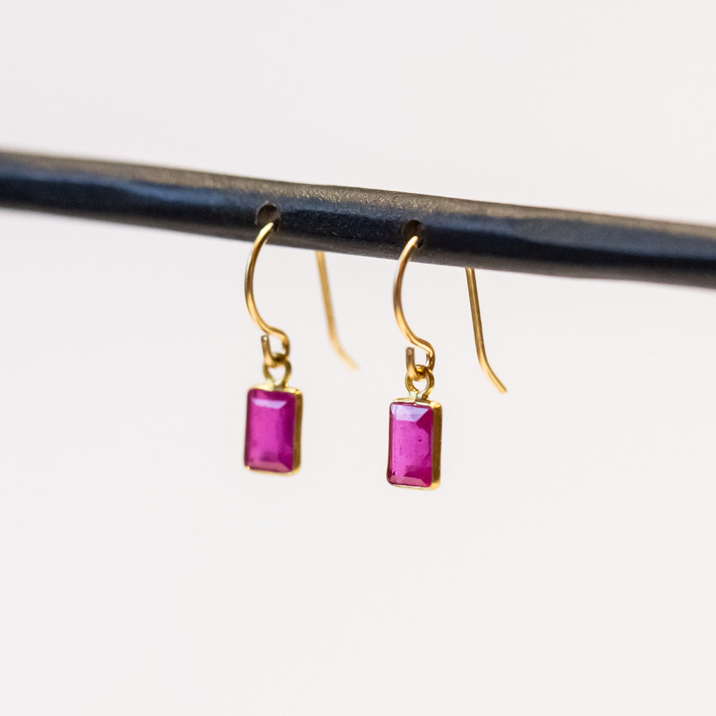 Ruby baguette drop earrings bezel set in 18k yellow gold