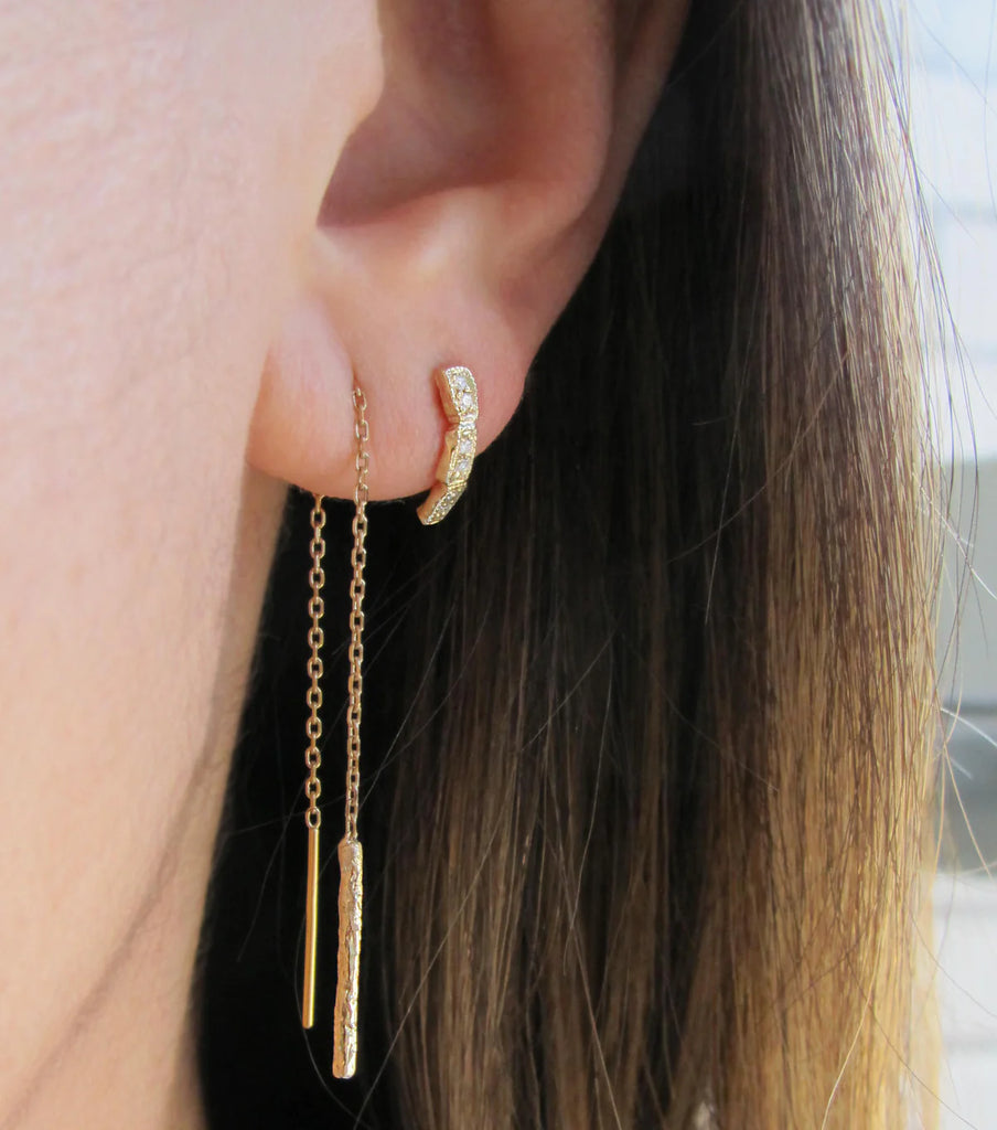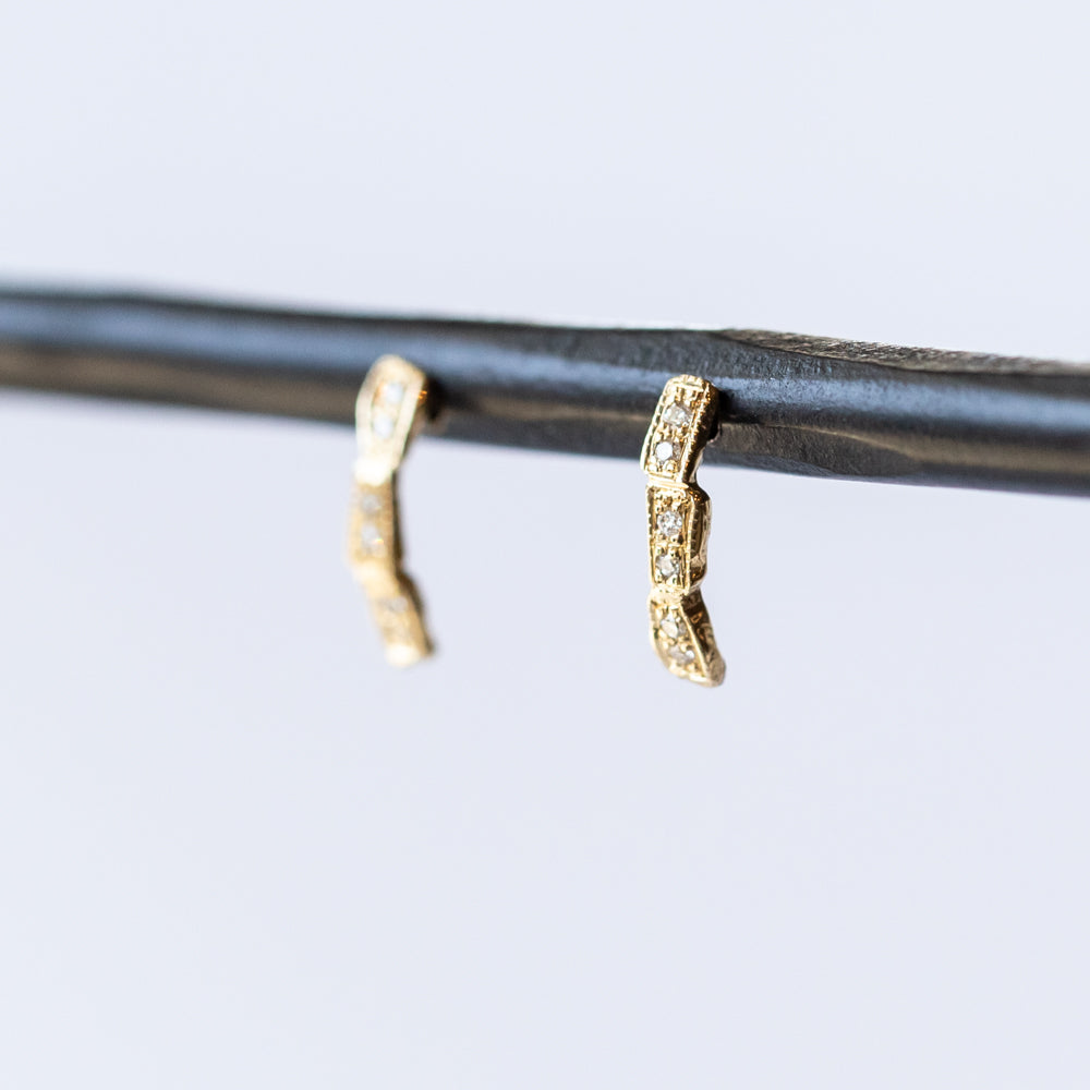 A little drop stud earring that echos nature's best sights—think rolling hills and layered canyons—these scenic curve earrings from Misa are kind of everyday perfection. Handcrafted in polished 14k yellow gold, these dainty gold studs have a slight drop and curve to hug your earlobe. Their surface is studded with petite white diamonds for just a hint of brilliance. And they look great solo or layered for the perfect ear stack.