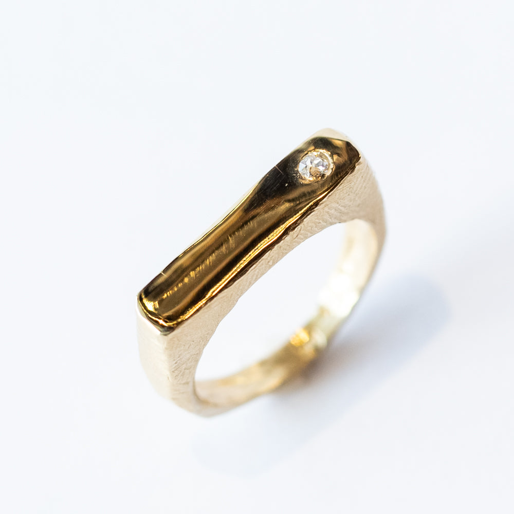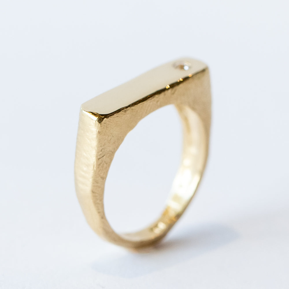 A modern heirloom with a little edge—this slender 18k gold signet ring takes tradition and flips it sideways. The elongated rectangular face stretches elegantly across your finger, polished to a gleaming finish with just the right amount of old-world charm. A single mine-cut diamond winks from one end.