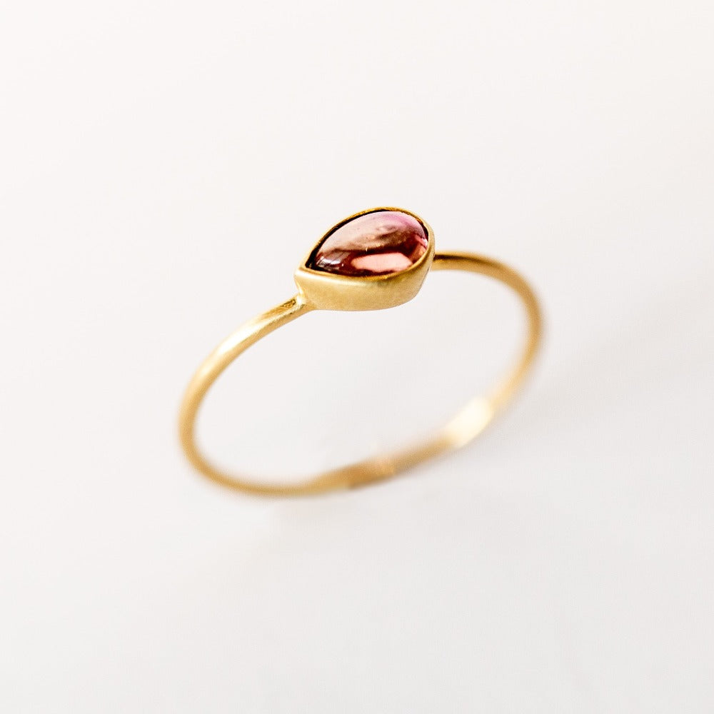 Small teardrop cabochon pink tourmaline ring bezel set in 14k yellow gold
