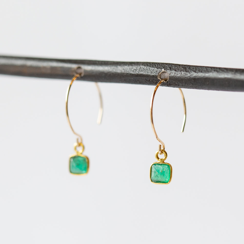 A modern twist on classic hoops, these handcrafted open wire hoop earrings feature tiny faceted square emeralds that sway with just the right amount of sparkle. Set in thin 18k yellow gold bezels, the vivid green gemstones bring a fresh, vibrant edge to everyday style. As the May birthstone, emeralds symbolize love, growth, and renewal—making these emerald earrings a meaningful gift for you or someone you love. The minimalist hoop silhouette keeps them versatile, while the square-cut emerald drops add a pop of personality. Perfect for stacking with other gemstone earrings or styling solo as your signature pair, these green gemstone hoops are equal parts chic and timeless.