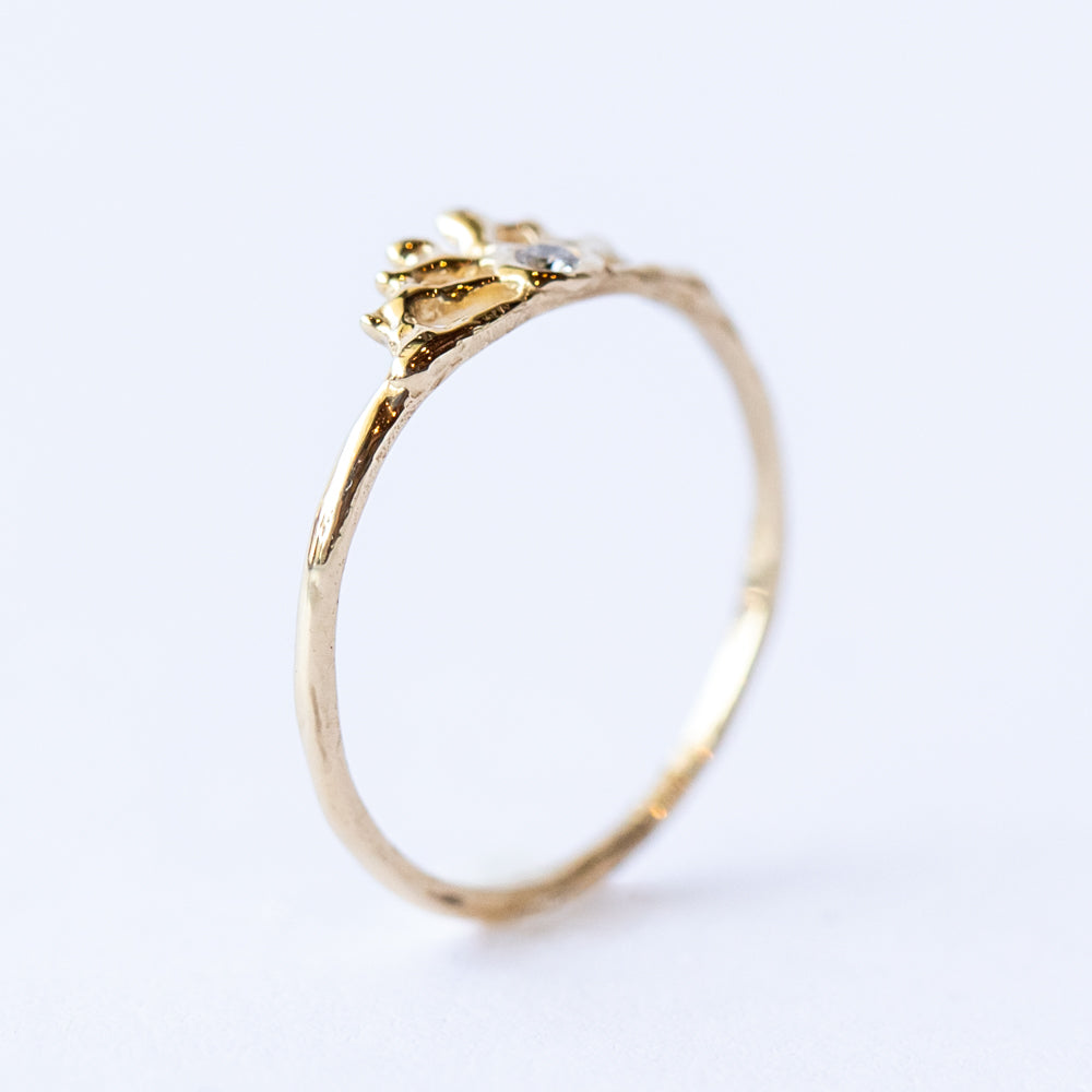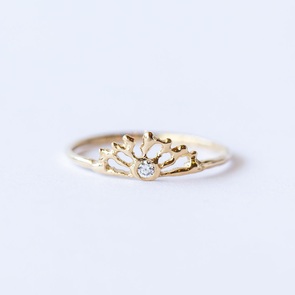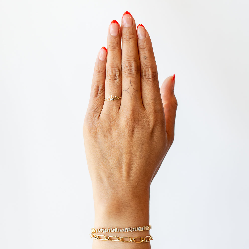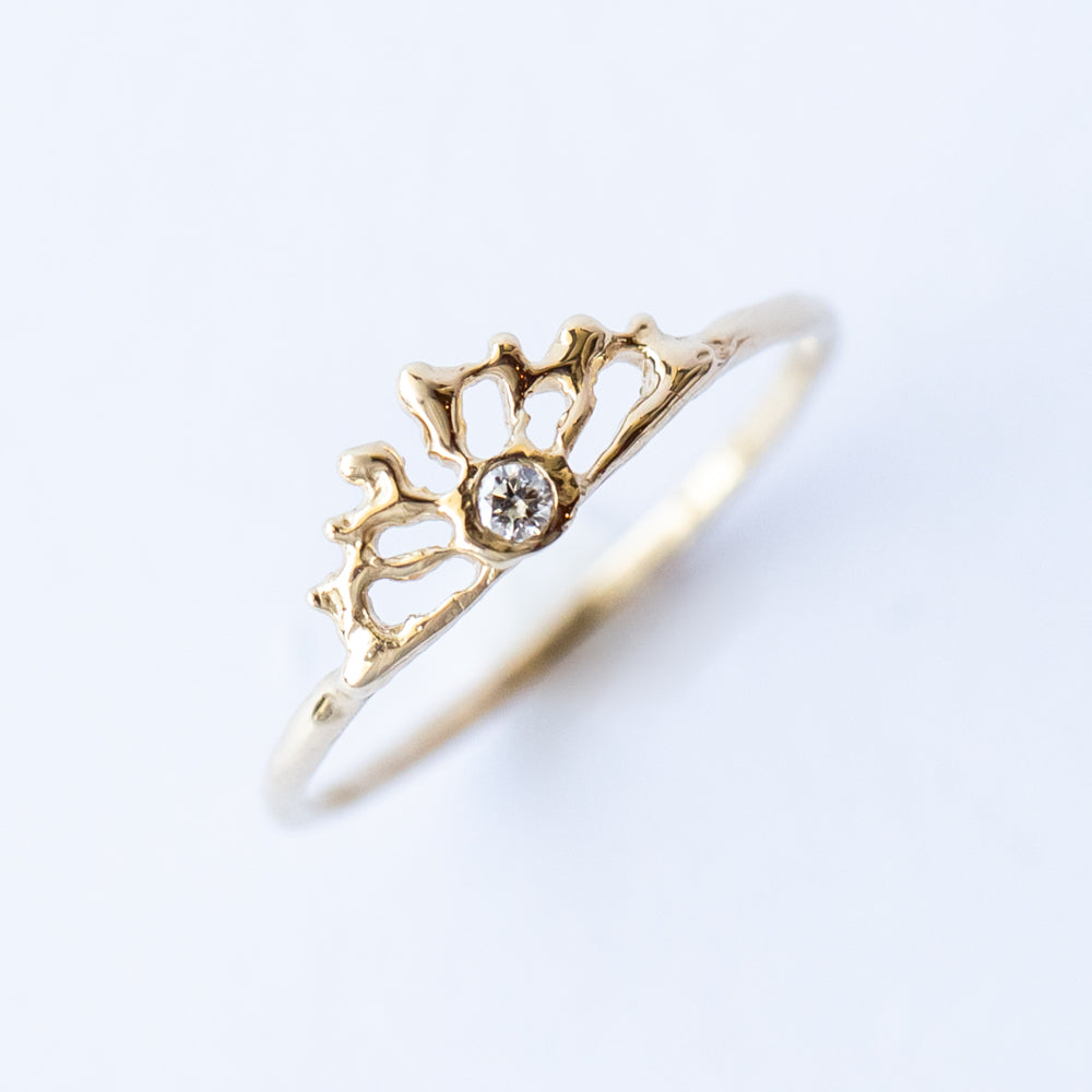 The Sunrise Ring by Misa is your little daily reminder to let the light in. With a softly sculpted sunrise motif and a single white diamond beaming from its center, this delicate gold ring brings a quiet glow to your everyday look. Stack it with other favorites for a layered story, or wear it solo as a minimalist moment with maximum charm. It’s golden hour, always.