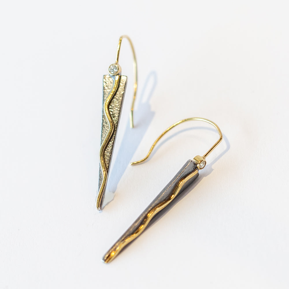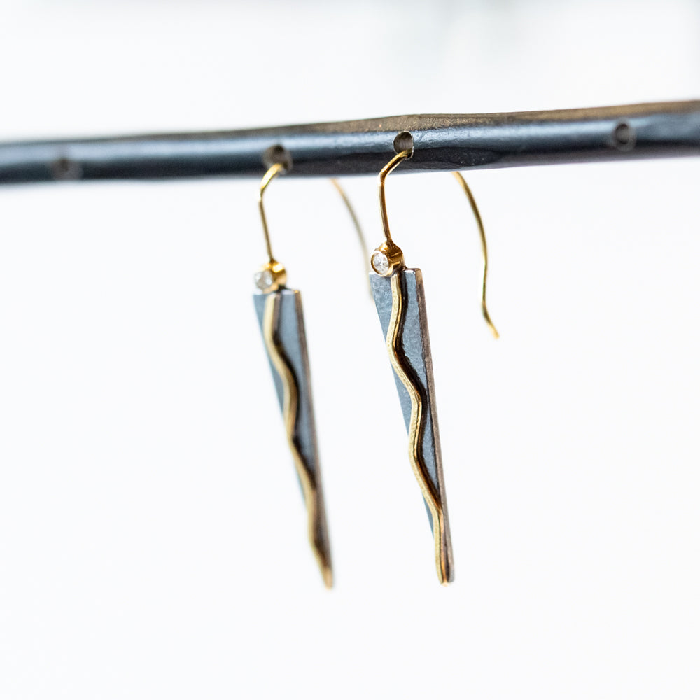 Want to add a little funk to your everyday jewelry collection? We love these edgy Kevin Lin drop earrings for just that. Handcrafted in textured sterling silver with an oxidized finish, these long, tapered triangle drops each feature a squiggle of solid 18 karat yellow gold down the front. The earrings are finished with petite white diamond accents for a hint of brilliance.